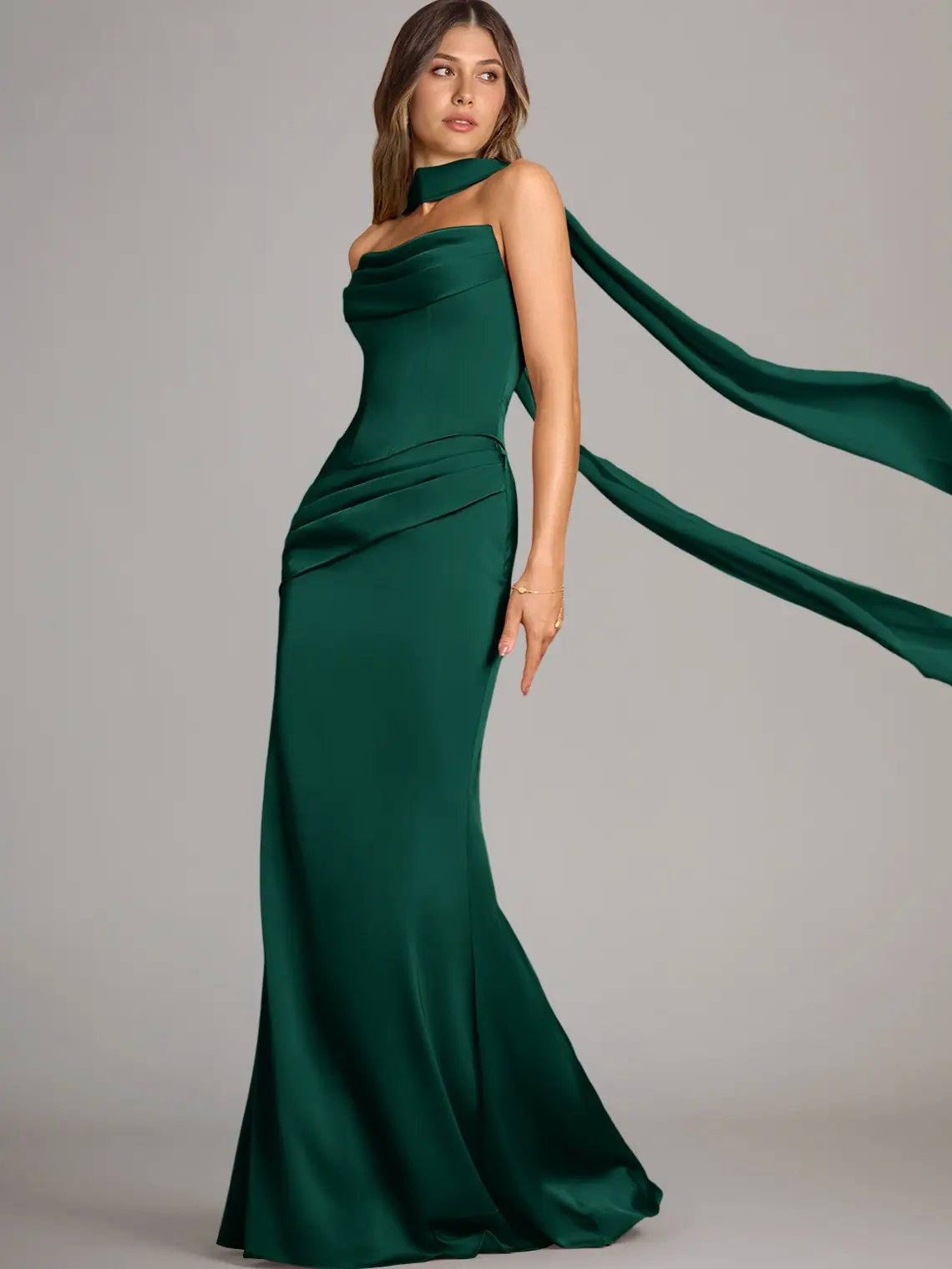 Strapless with a halter scarf moment — this dress feels instantly elevated. The flowing neck tie makes every step look cinematic #azazie #tiktokmademebuylt #datenightoutfit #formaldresses #sales #straplessdress #bridesmaiddresses