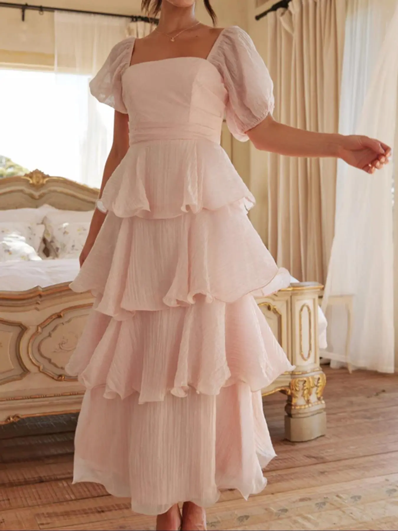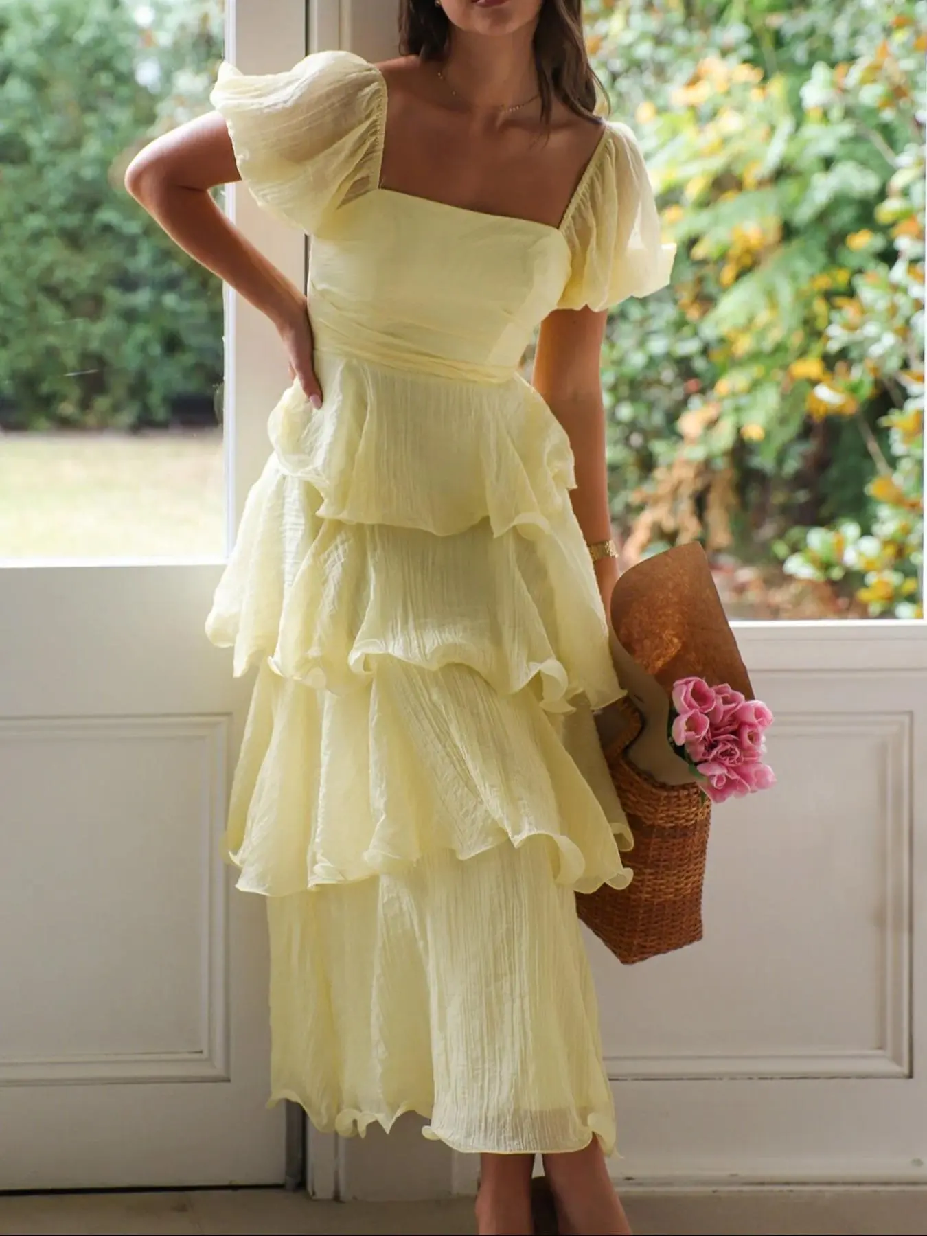 Elegant French Style Square Neck Bubble Sleeve Backless Layered Midi Dress, Casual Fitted Plain Design, Perfect for Vacation Wear