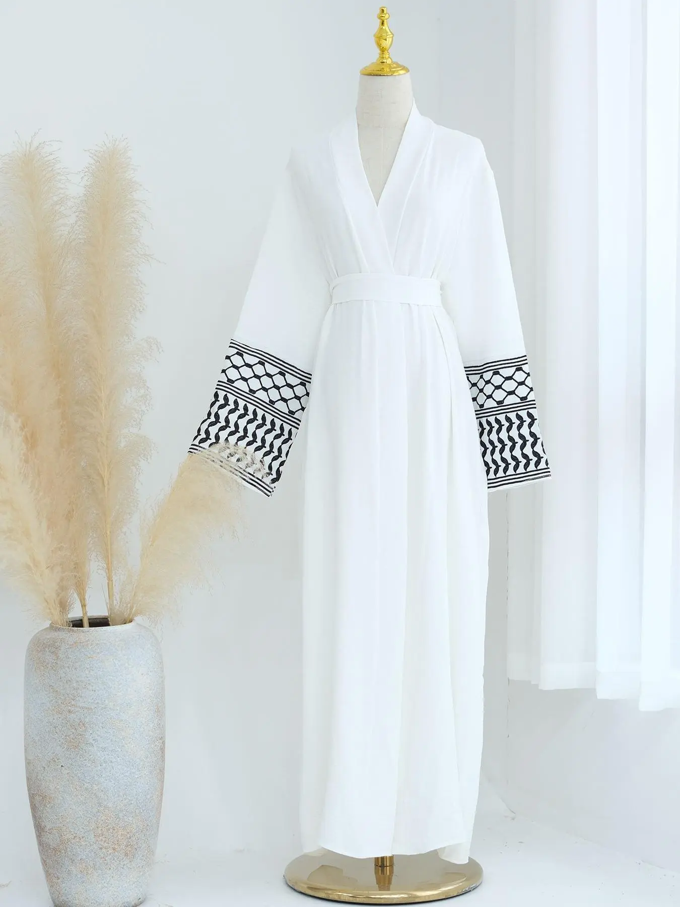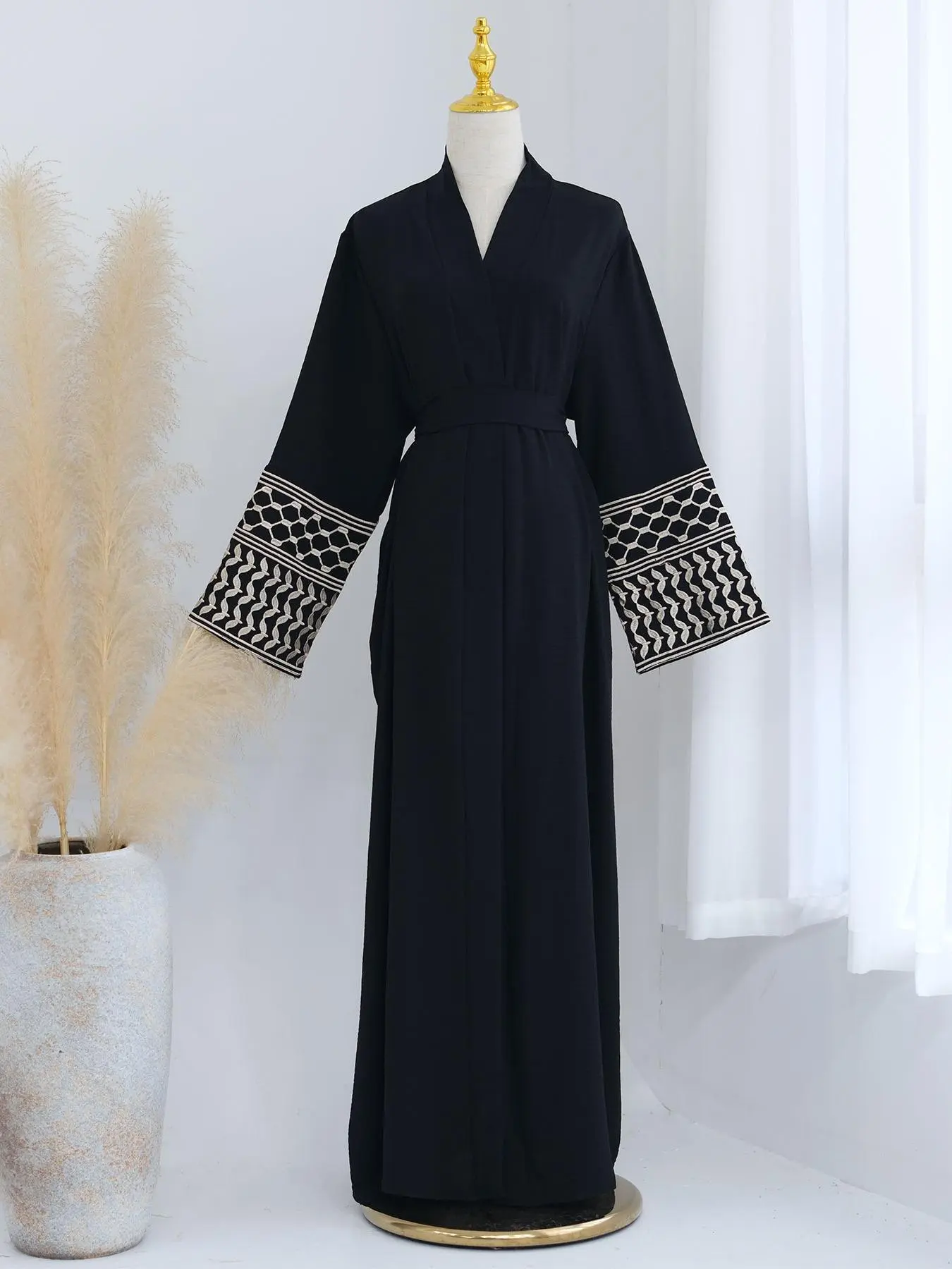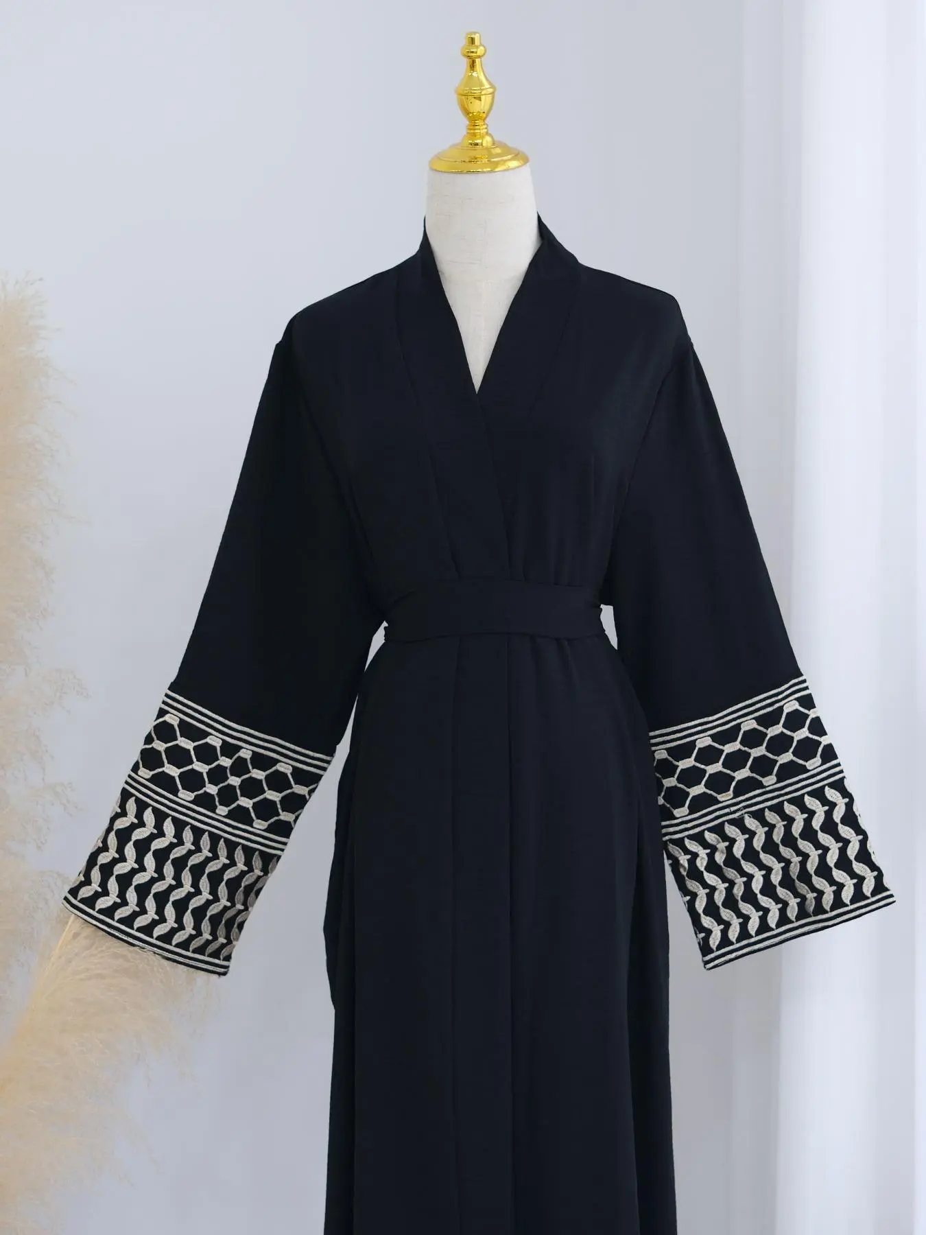 5. Muslim open abaya clothing Elegant Women's Ramadan Solid Color Embroidered Cardigan Abaya Dress, Modest Loose-Fitting Robe with Belt and Pockets for All Seasons, Modesty Abaya, Belted Abaya
