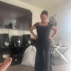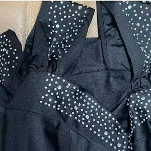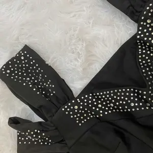 This black off-shoulder dress features a beaded fishtail skirt, exuding mystery and elegance. The off-shoulder design highlights charming shoulders and neck, while the beaded decoration adds glamour. The fishtail cut outlines graceful curves, and the slit enhances sexiness and agility. Perfect for making a statement.