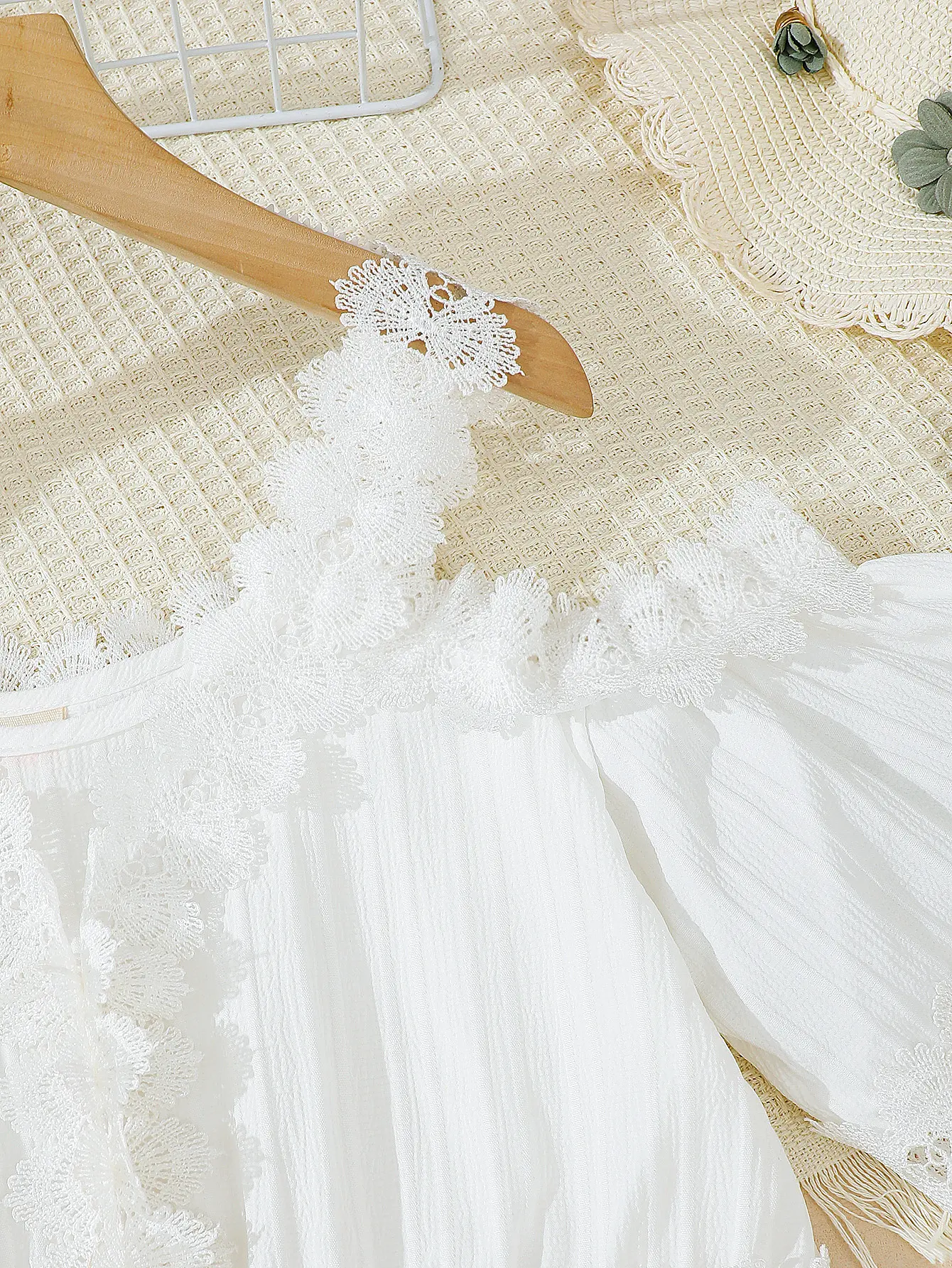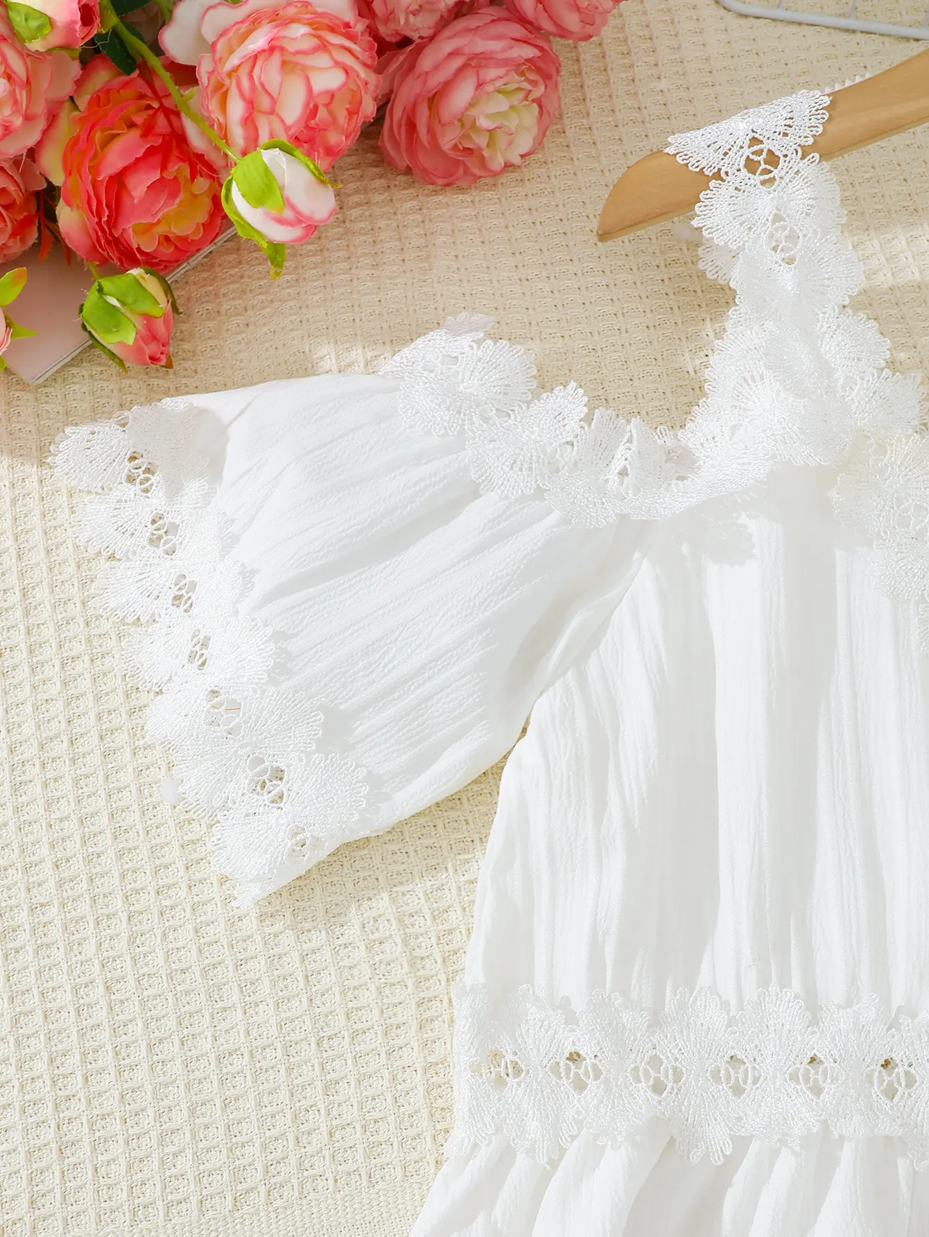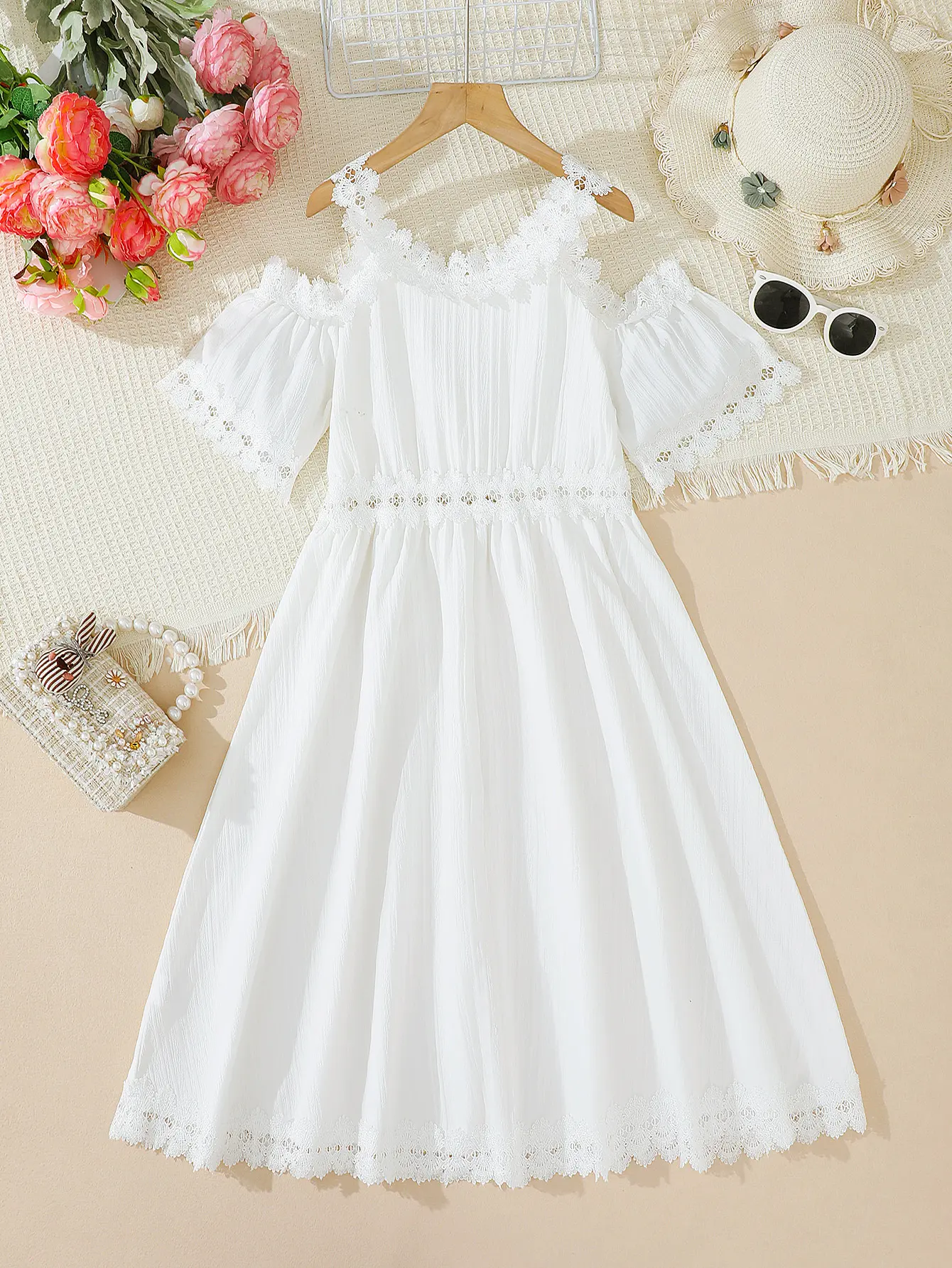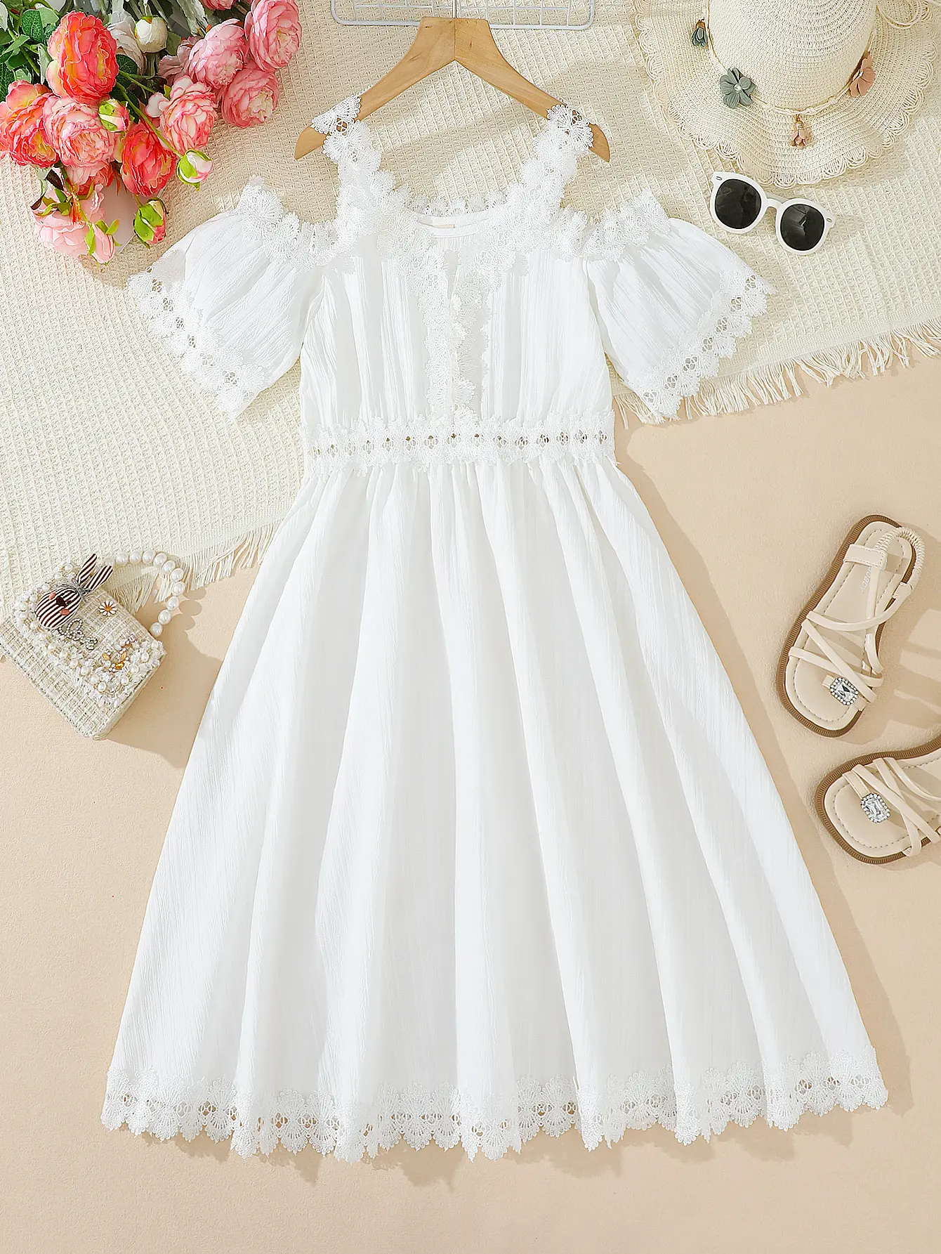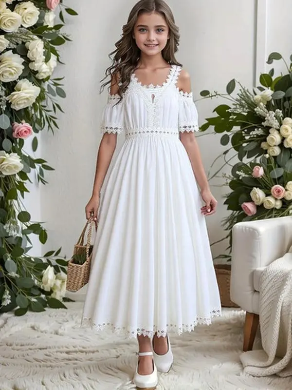 Ready Stock Elegant Tween Girls' all white clean girl clothes girly clothing Lace-Trimmed Off Shoulder White Dress - Perfect for Weddings, Beach Vacations, and Summer Events 42502007