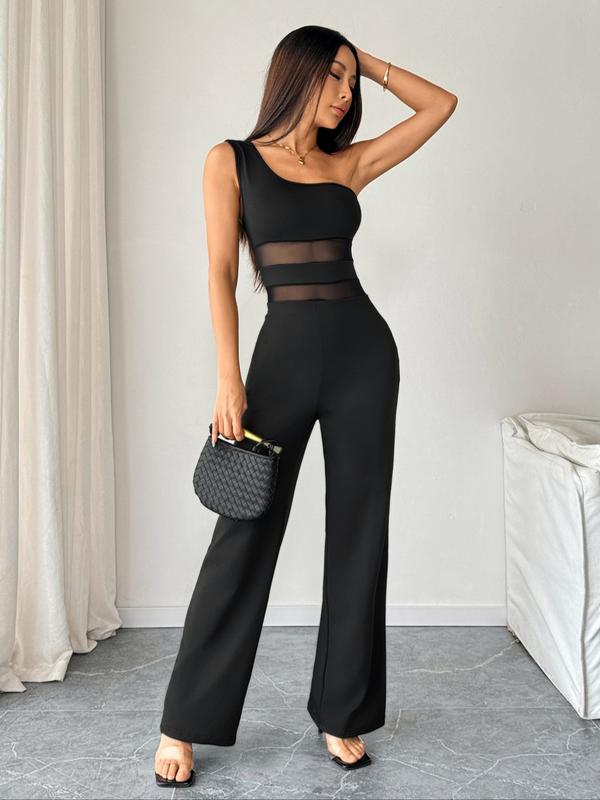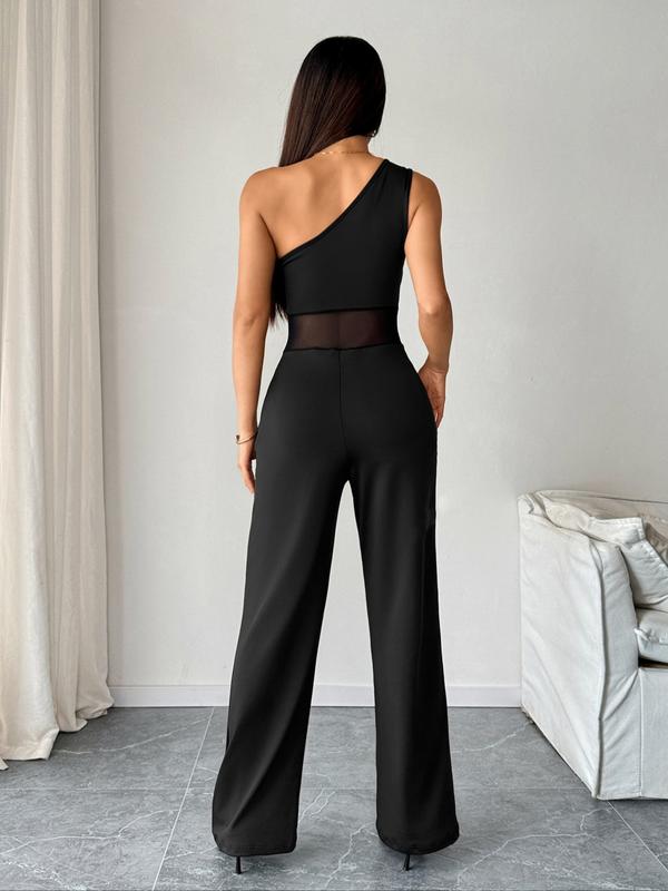 Elegant Solid Color One Shoulder Jumpsuit for Women, Mesh Splice Design, High Stretch, Breathable Fabric, All Season Versatile, Suitable for Casual and Formal Evening #TikTokShopBlackFriday #TikTokShopCyberMonday #spotlightfinds #ootd/  #clothing