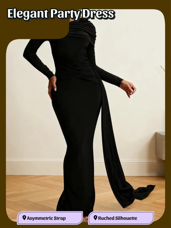 Elegant Party Holiday Dress with Side Long Tie, Asymmetrical Single Shoulder Ruched Bodycon, Women's All Seasons Fashion #longsleeveformaldress #amazonholidaydress #sheindresses #hotdresses #blackpromdress #maxidressoutfit #affordabledresses #curvydresses #dressesforwaddingguests #beadedpromdress