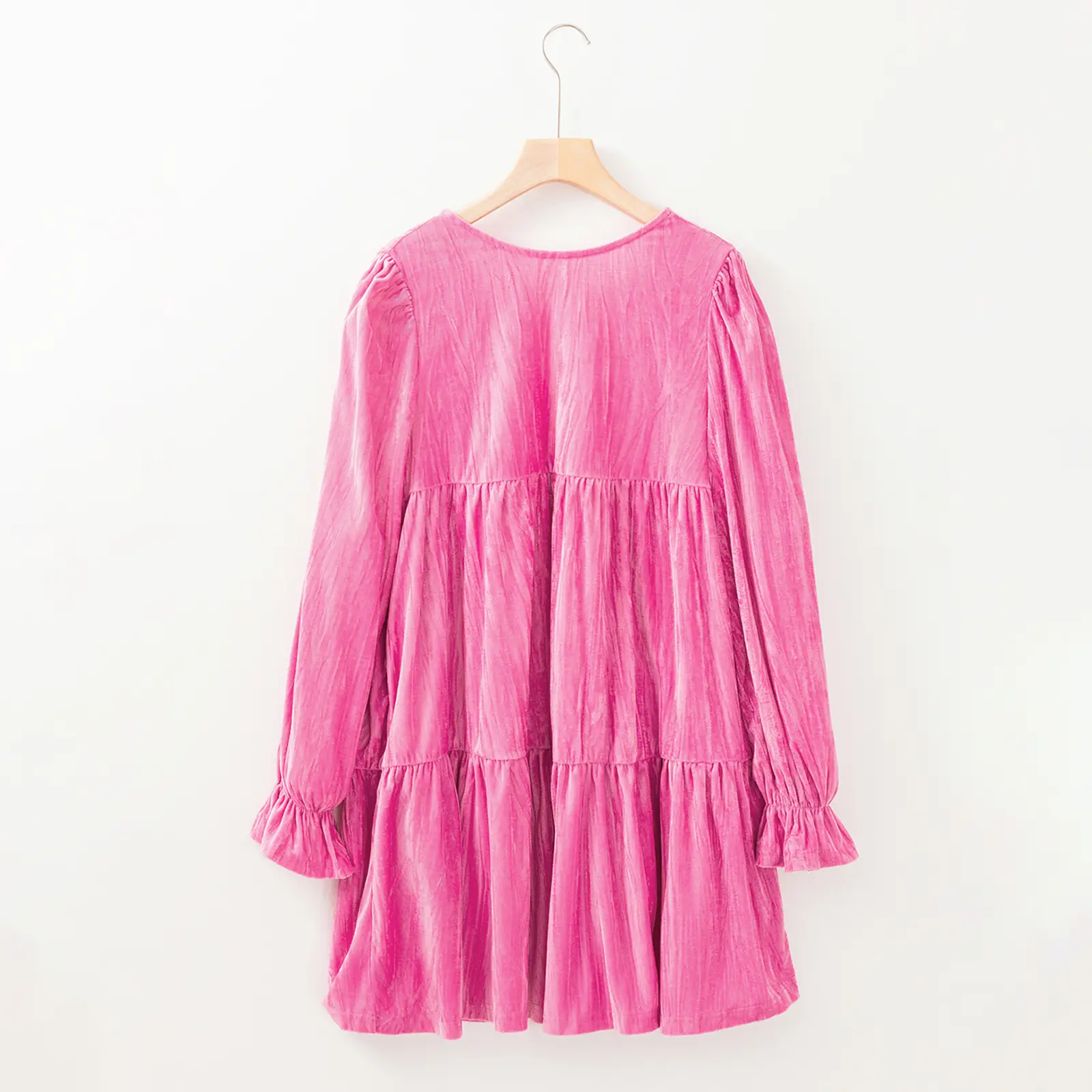 Discover the Asvivid Women's Pink Flounce Sleeve Velvet Mini Dress. Crafted from velvet material, it also offers a soft texture. The dress features elegant flounce sleeves and cascading tiered ruffles, creating a playful, feminine silhouette. It moves gracefully with you, making it perfect for cherished moments.