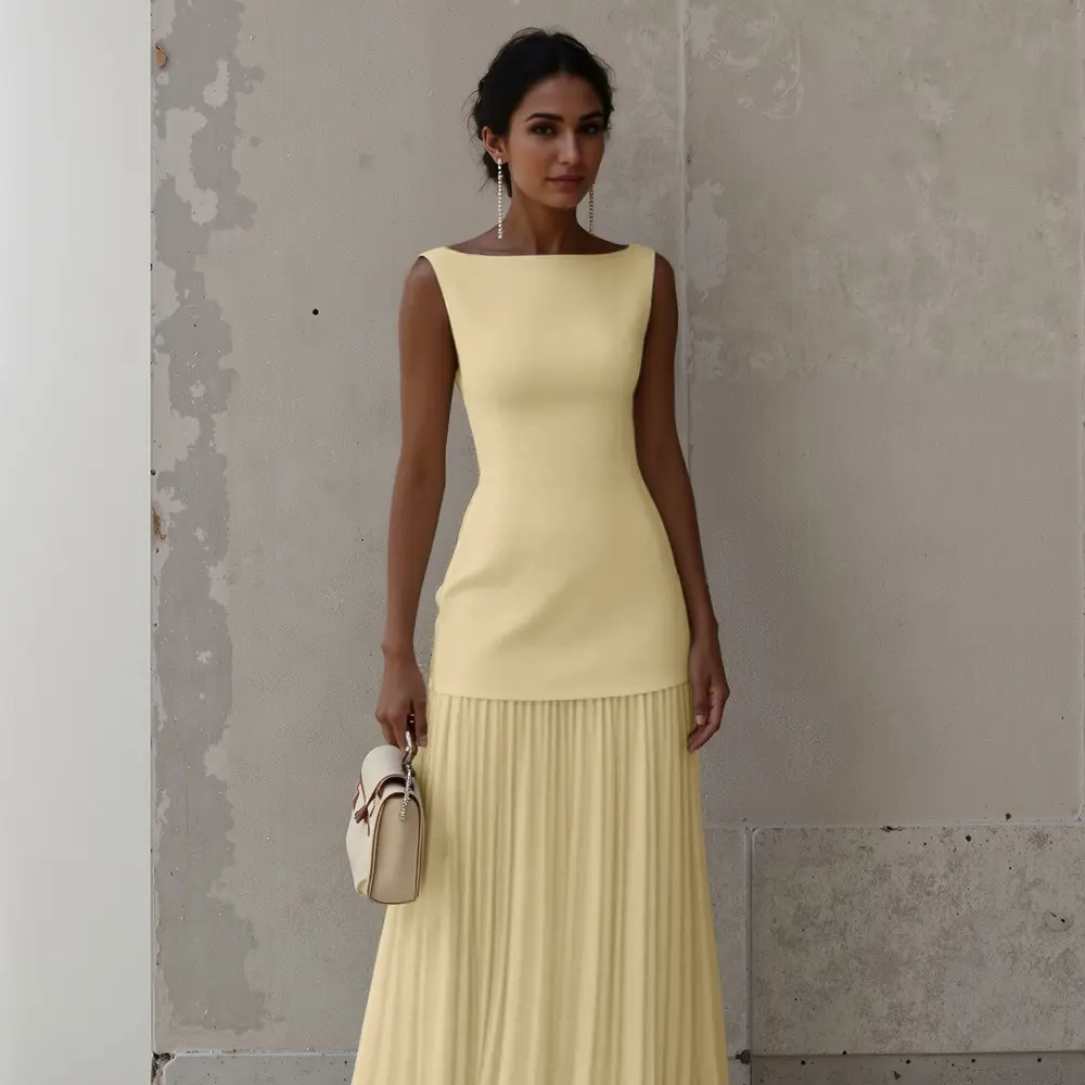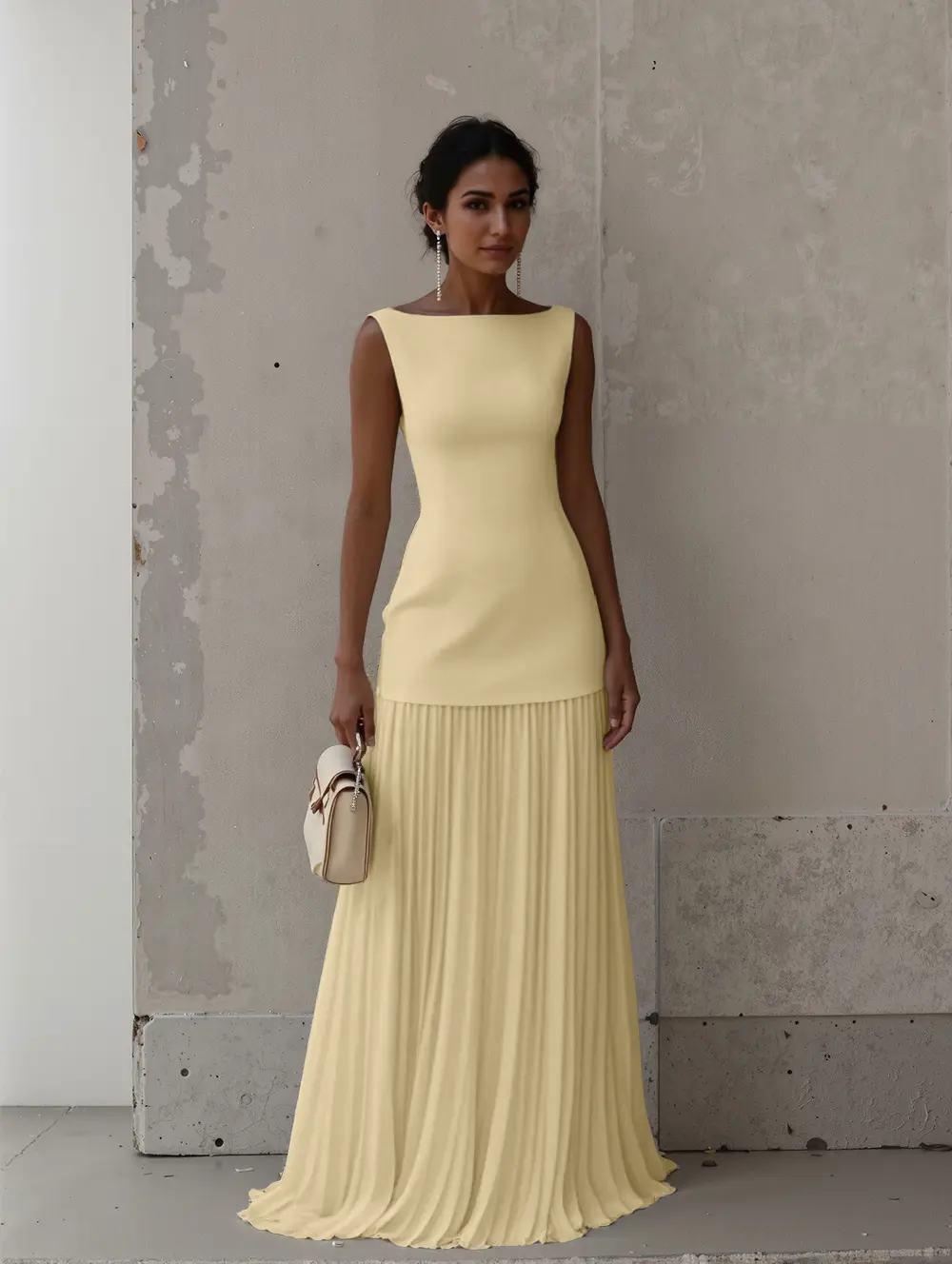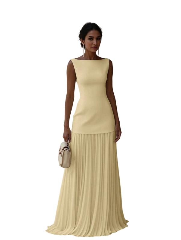 Timeless elegance and sophistication, this maxi dress features a classic boat neckline and all-over pleating for a light and nimble look.