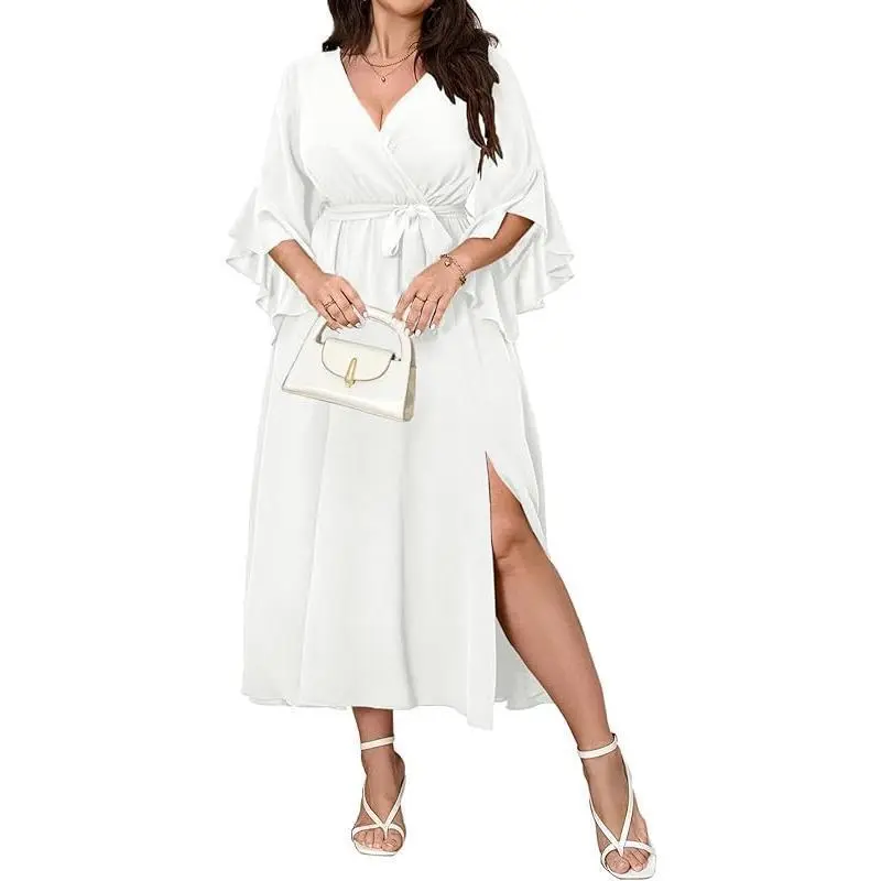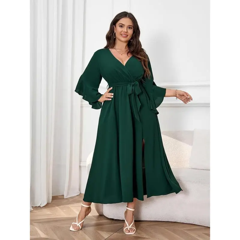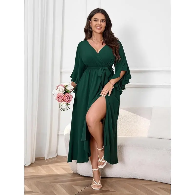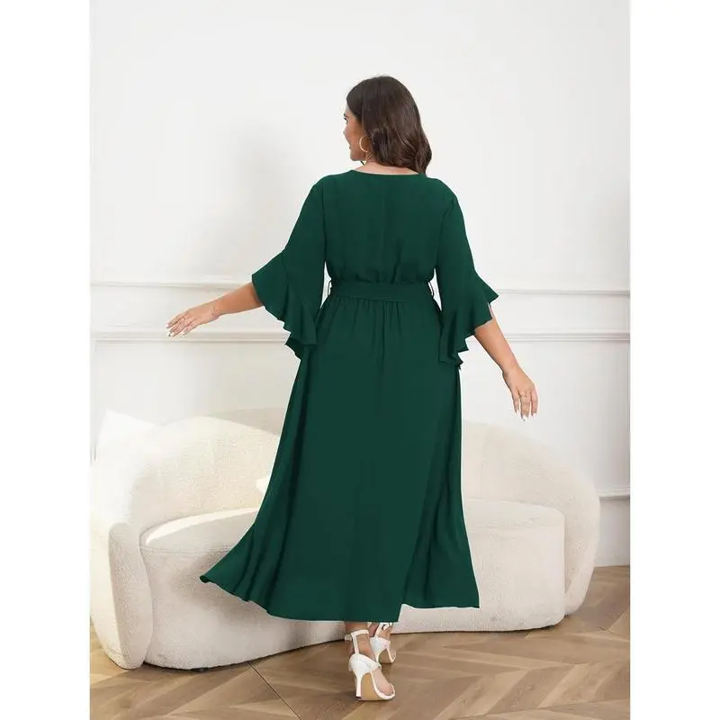 🎉 Elegant Plus Size Wrap Dress/✨ Discover the perfect dress for your special occasions! This V-neck ruffle sleeve maxi dress is a versatile choice for wedding guests and cocktail parties. Its minimalist design ensures it pairs effortlessly with any outfit. The dress comes with a belt, enhancing its flattering silhouette. Ideal for those seeking a classic yet chic look./Key Features 👗/Perfect for Any Event 🎉/This dress is a basic black masterpiece, suitable for various events. Its simplicity allows it to stand out while maintaining a understated charm. Whether you're attending a wedding or a cocktail party, this dress will ensure you look polished and put-together.