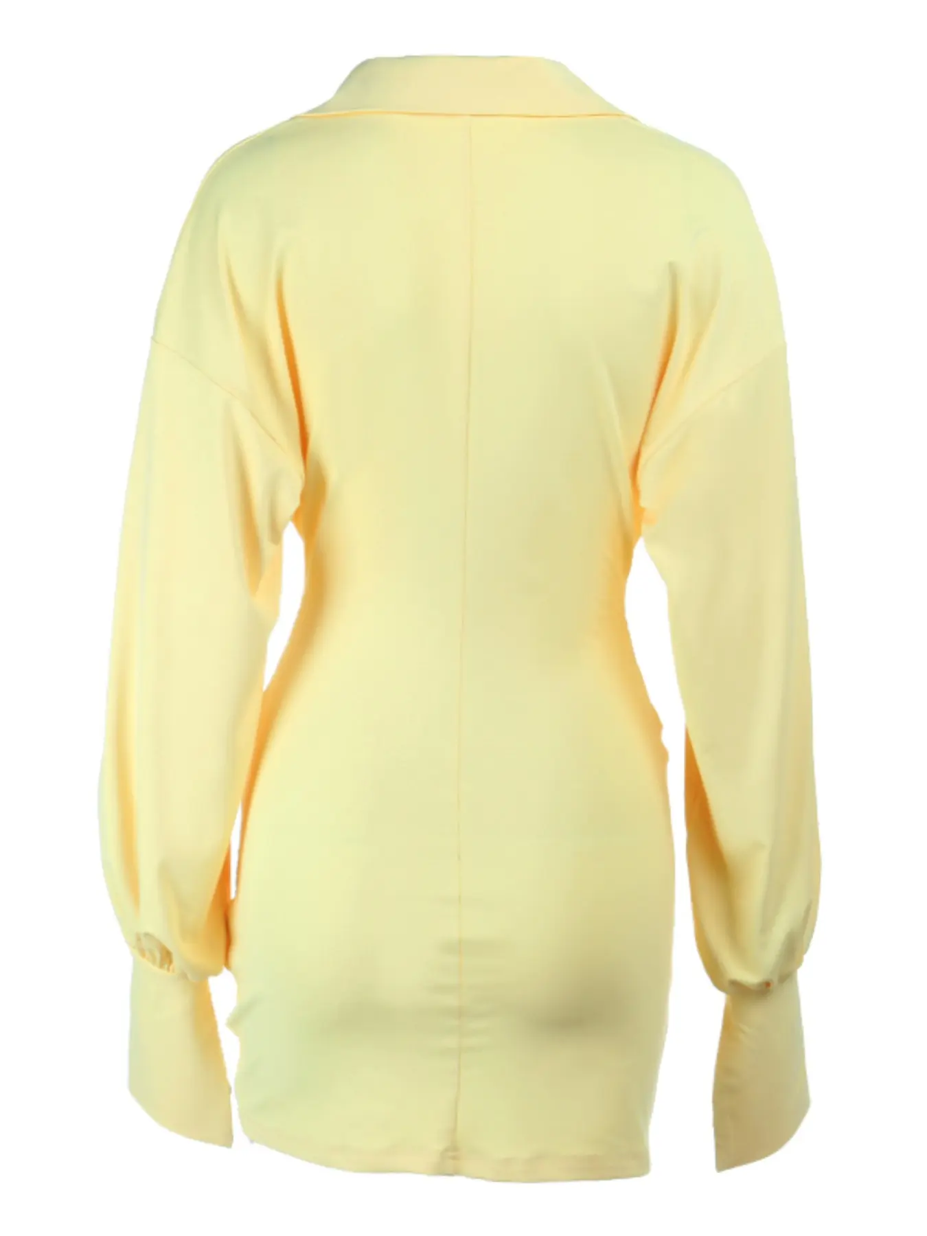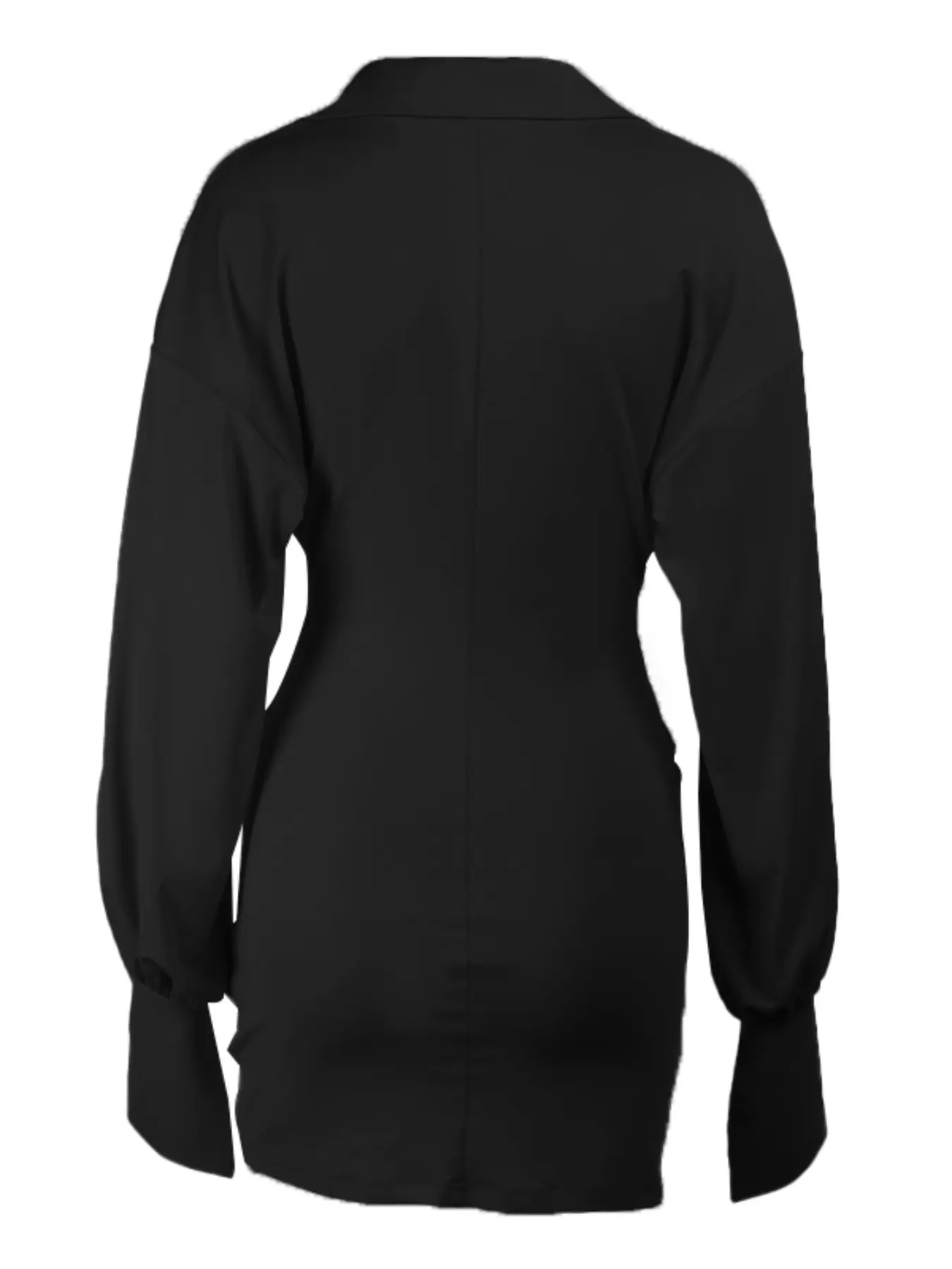 The dress is just like the ad. Is very stretchy almost like costume fabric but for this it really works. Hugs your curves while staying loose for a deep plunge. You can also button it up higher if you don’t want the plunge as low as mine. So femine and cute.