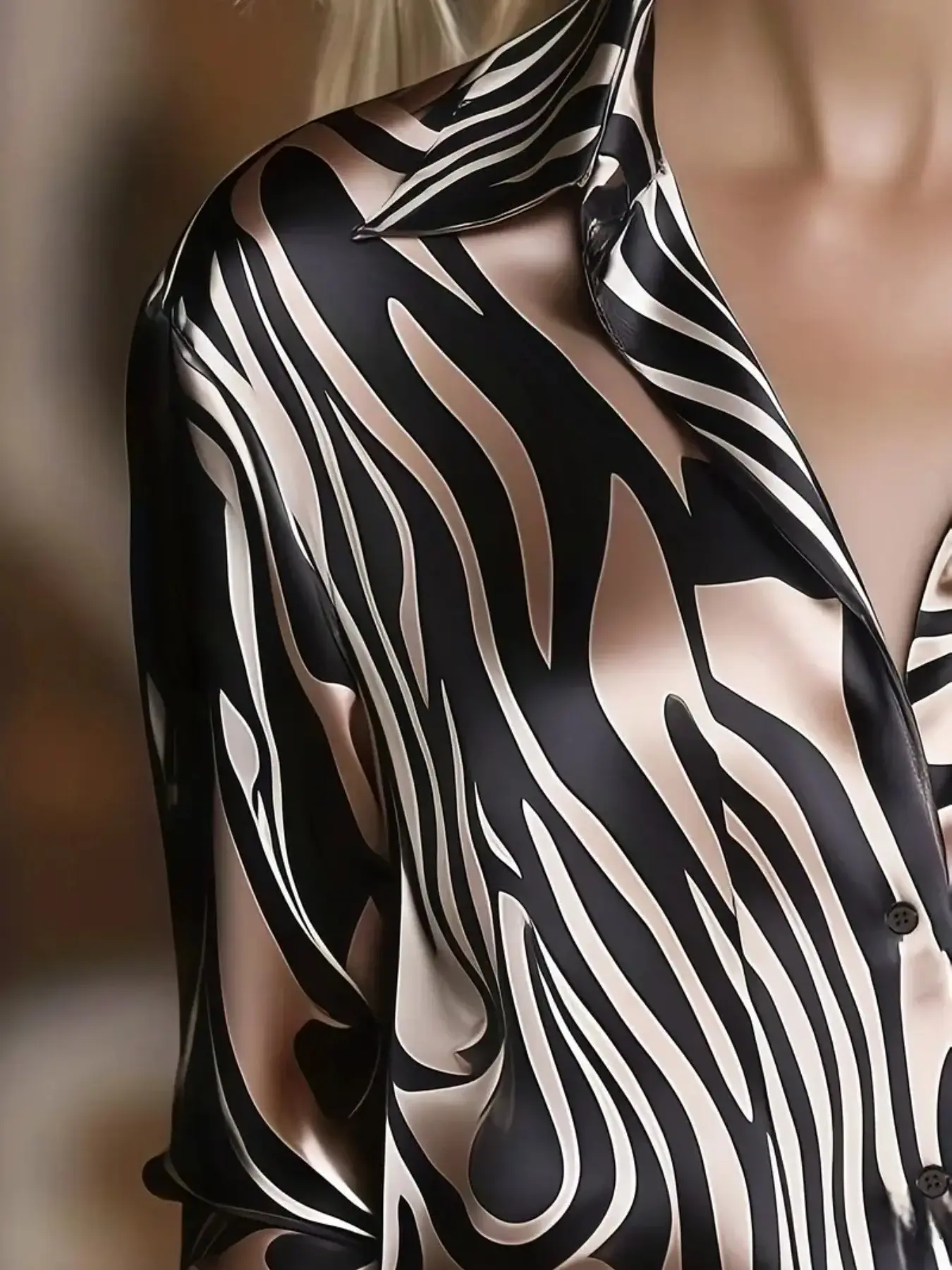 Elegant Satin Zebra Print Blouse for Women, Spring & Fall Fashion, Stylish Ladies' Top, Comfortable and Chic Design #womenfashion #womanfashion #fashionablewomensclothing #aifashion #oversizedblouse #blouseoutfit #blousesfashion #fashiontops #womensfashionfinds #womenfashionshop