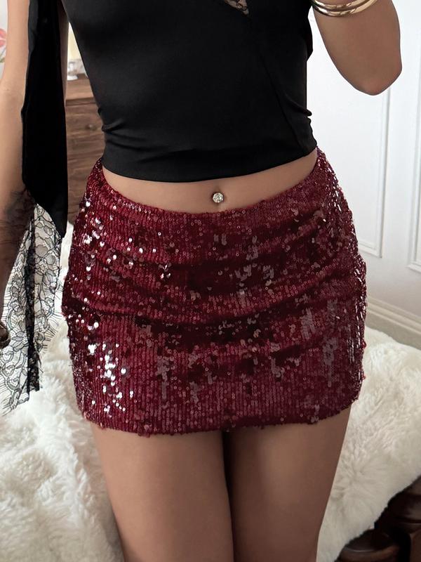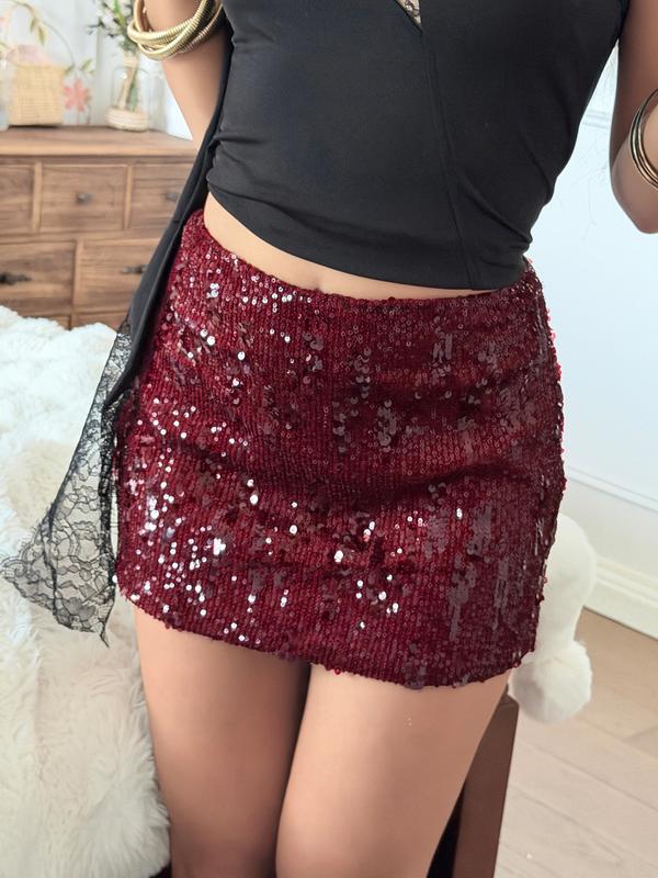 Can’t get over how stunning this red sequin ruched skirt is— the rich burgundy hue exudes luxury, and the stretchy fabric ensures a comfy fit for dancing all night long💯 #BurgundySequinSkirt #PartyMiniSkirt #SparklyWear #GlamorousStyle