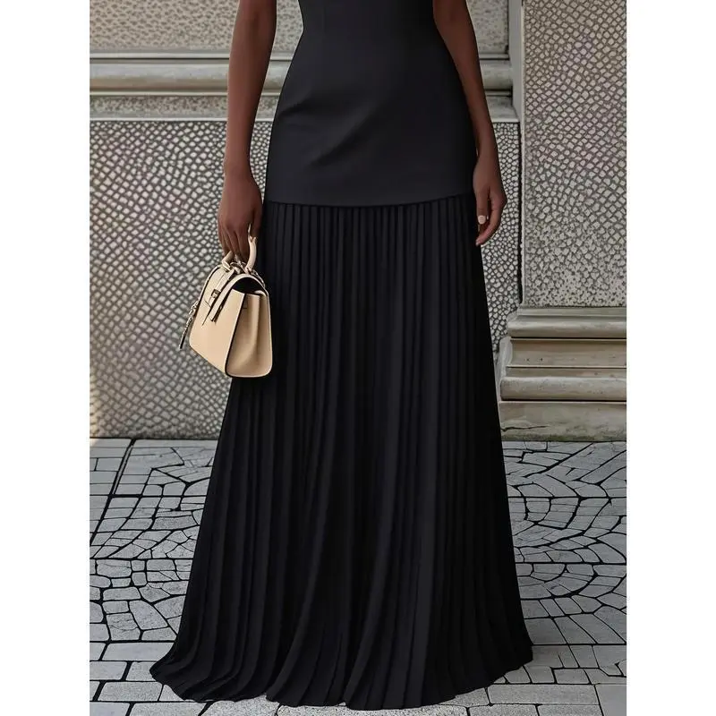 Composition: 100% Polyester/Material: Polyester/Length: Long length/Belt: No/Sleeve Length: Sleeveless/Chest Pad: No Padding/Hem Shaped: Pleated/Details: Pleated/Pattern: Solid color/Applicable People: Adult/Sheer: No/Dresses Length: Long length/Silhouette: Pleated/Type: Fitted/Contour: H/Season: All-season/Operation Instruction: Hand wash,do not dry clean/Style: Elegant/Fit Type: Regular/Fabric Elasticity: No Elasticity/Printing Type: No Printing/Weaving Method: Woven/Collar Style: Boat