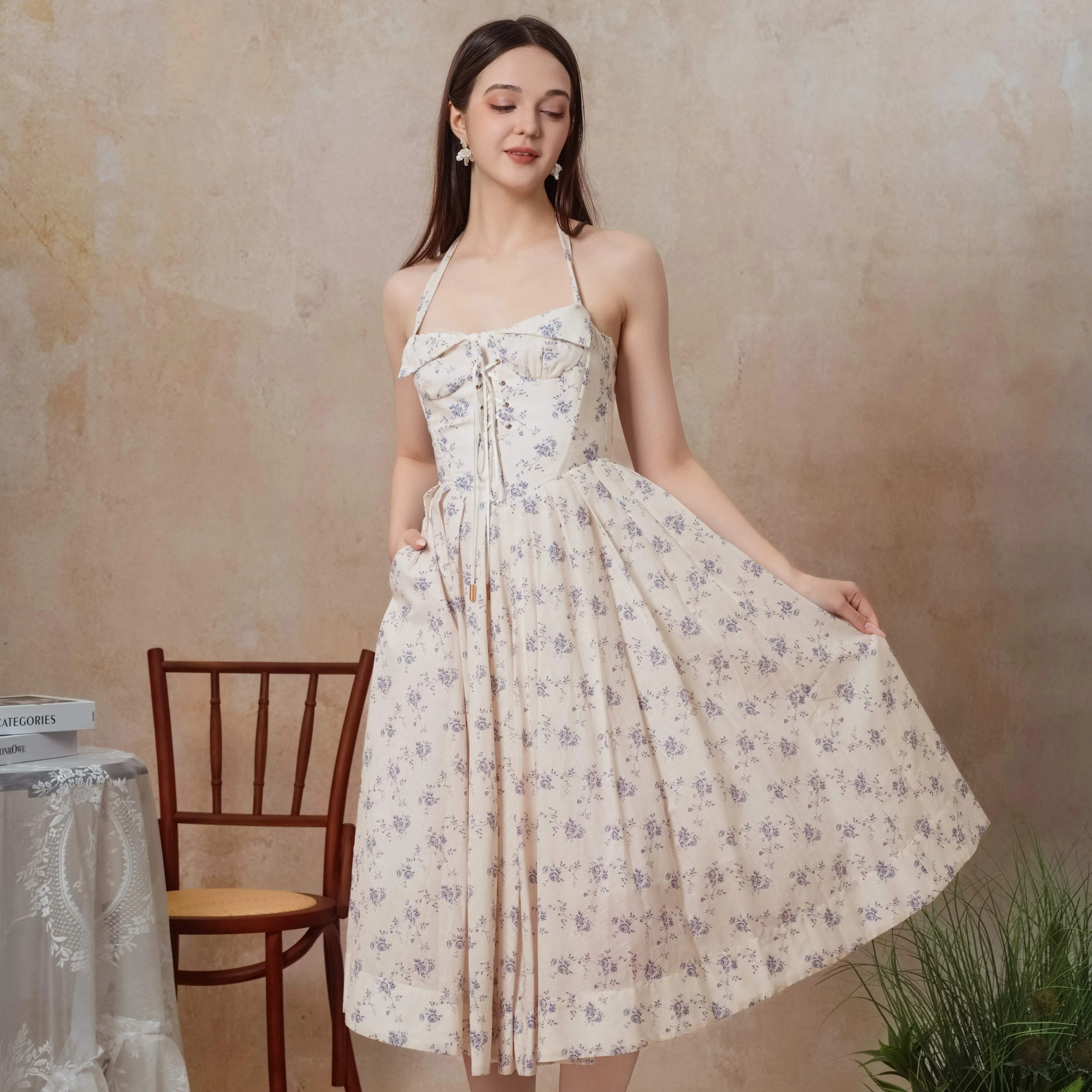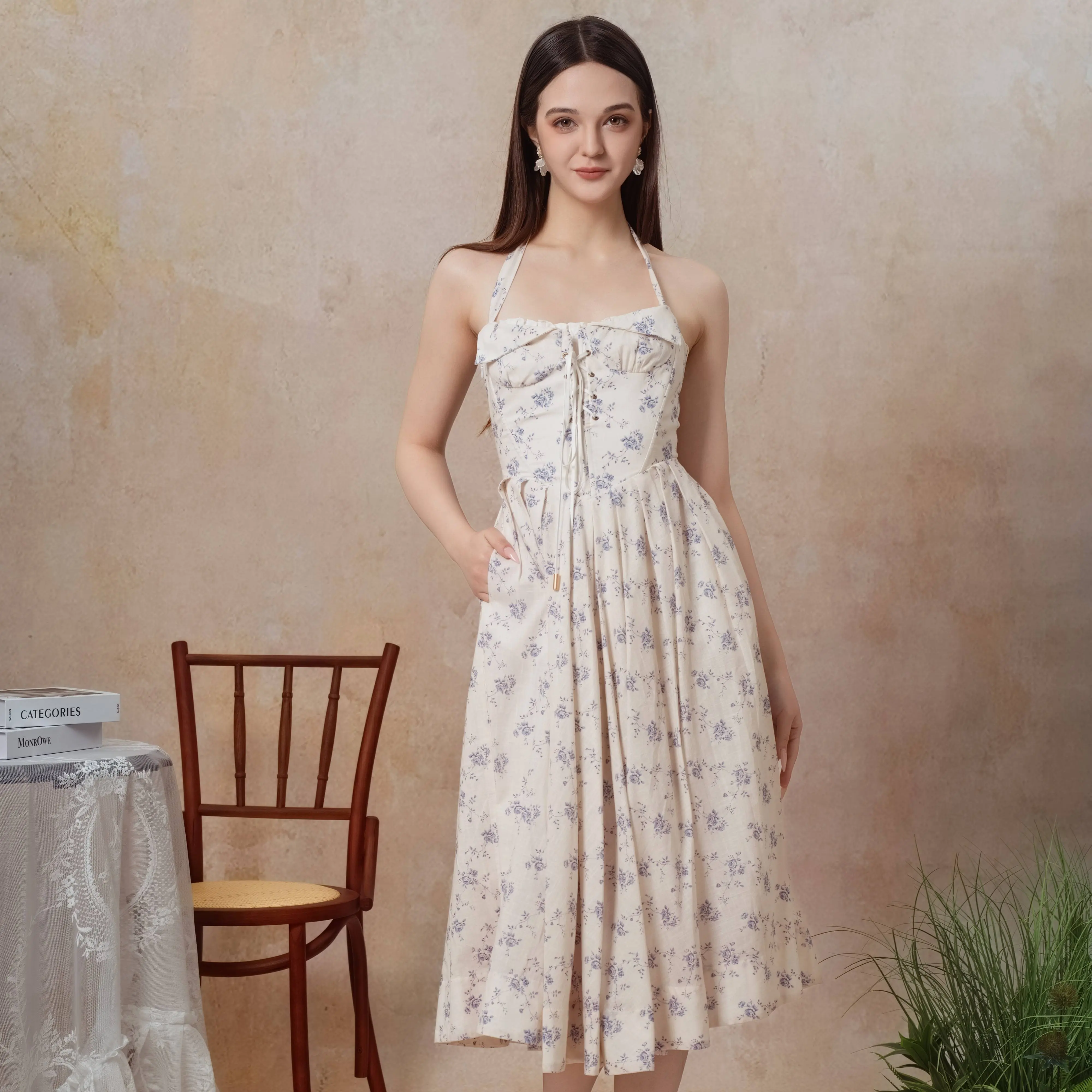 it’s 100% cotton and has hidden pockets! you can even wear it in the winter if you put a cardigan over the dress. I’m 5’4 120 pounds and 26-27 inch waist. Medium was perfect for me- the dress can hold itself up without the strap. If large size, the dress would fall down without strap but still works