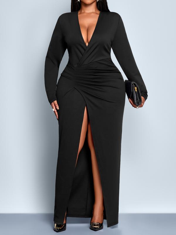 5. Elegant Solid Color Maxi Dress, Deep V Neck Long Sleeve Bodycon High Waist Split Hem, Plus Size Women's Fall Fashion Party Dress