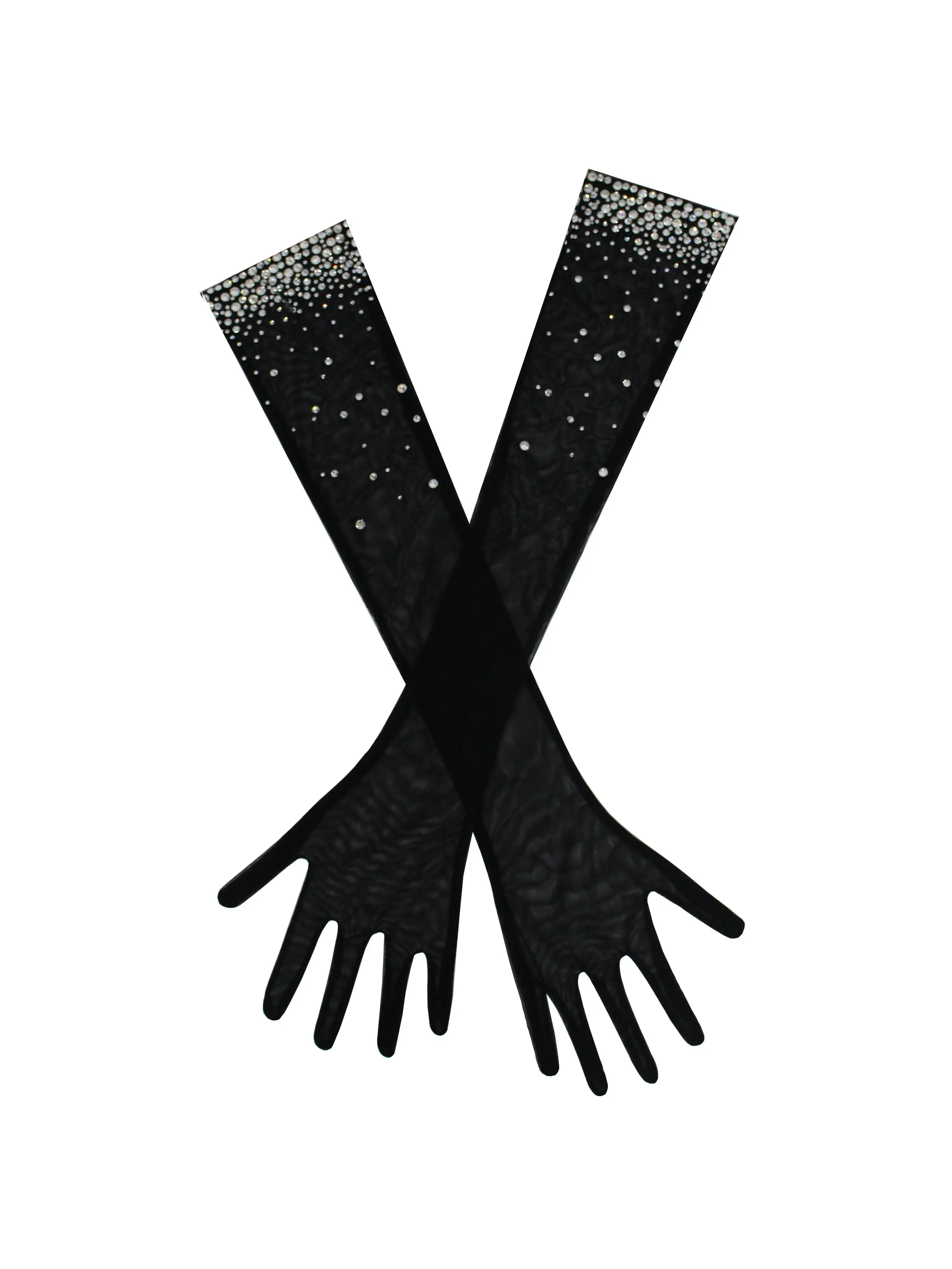 top arm opening. These gloves exude sophistication and glamour, extending gracefully to enhance any ensemble. The sparkling crystal embellishments add a touch of opulence, making them perfect for formal occasions, weddings, or a night on the town. Embrace the allure of refined style and make a dazzling statement with these stunning opera-length gloves. Available exclusively in black and white.