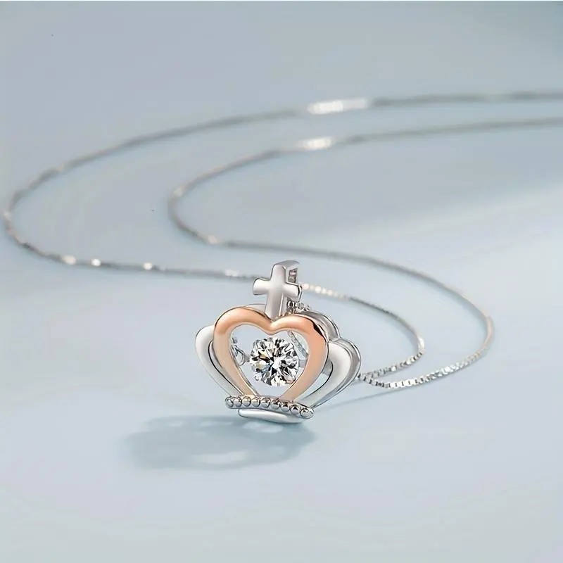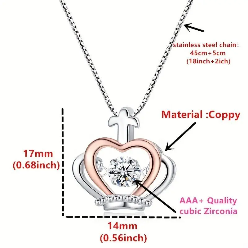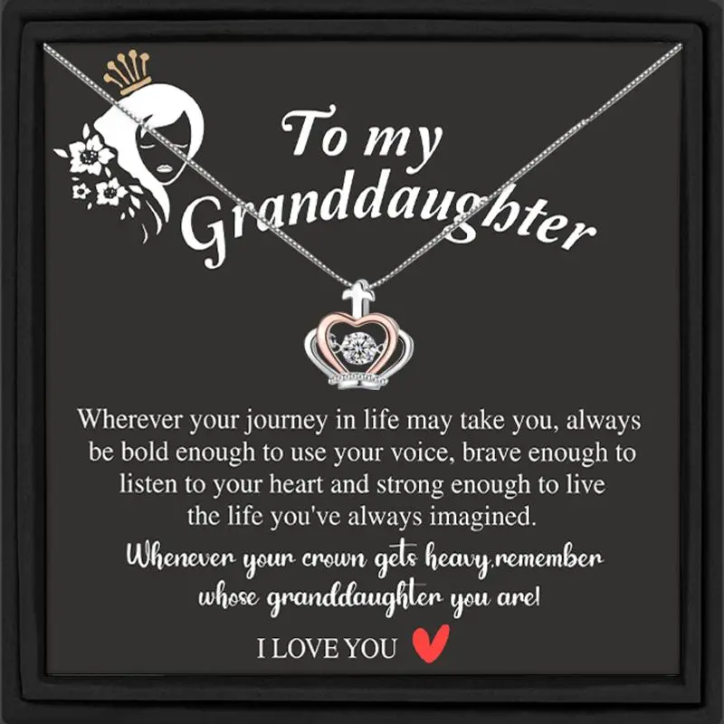 This "to My Granddaughter" Cubic Synthetic Zirconia Crown Pendant Necklace is a perfect gift. It features a white golden-plated (K14) heart-shaped princess-like stone. Ideal for birthdays, graduations, or Christmas, this necklace is designed for women. It serves as an elegant tiara accessory, adding a touch of sophistication to any outfit.