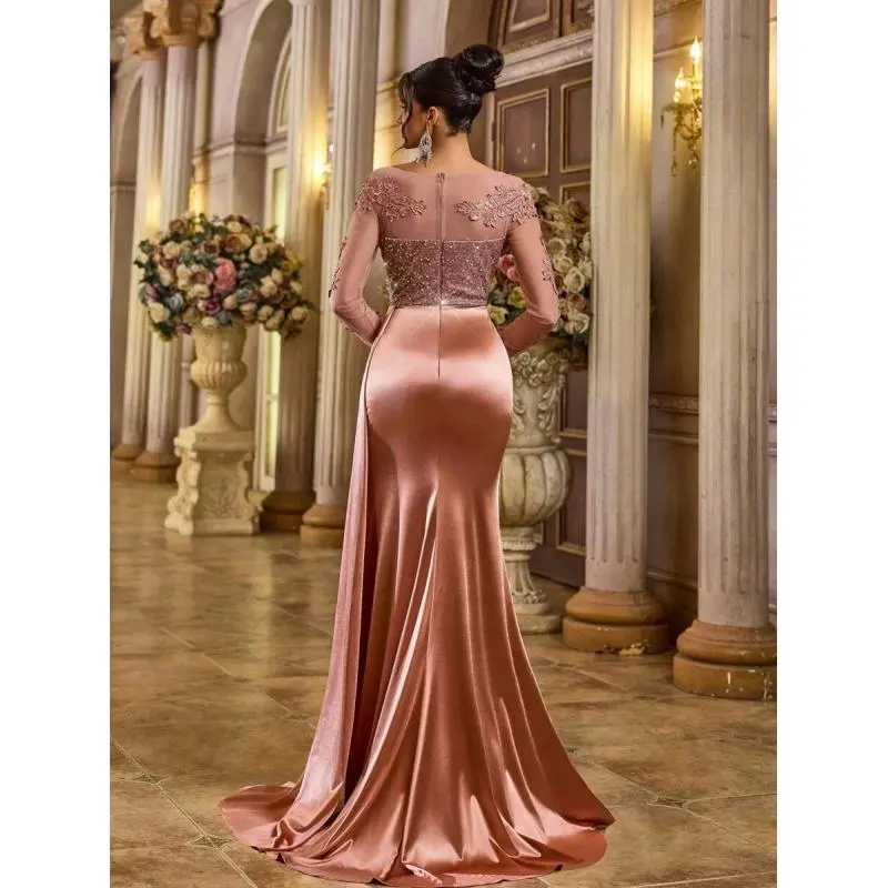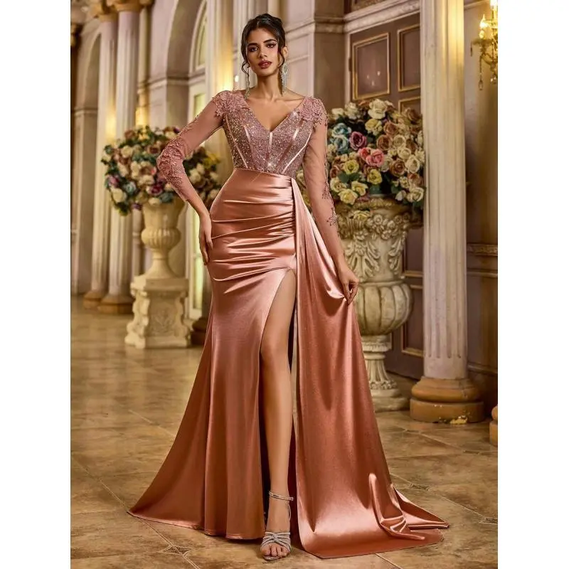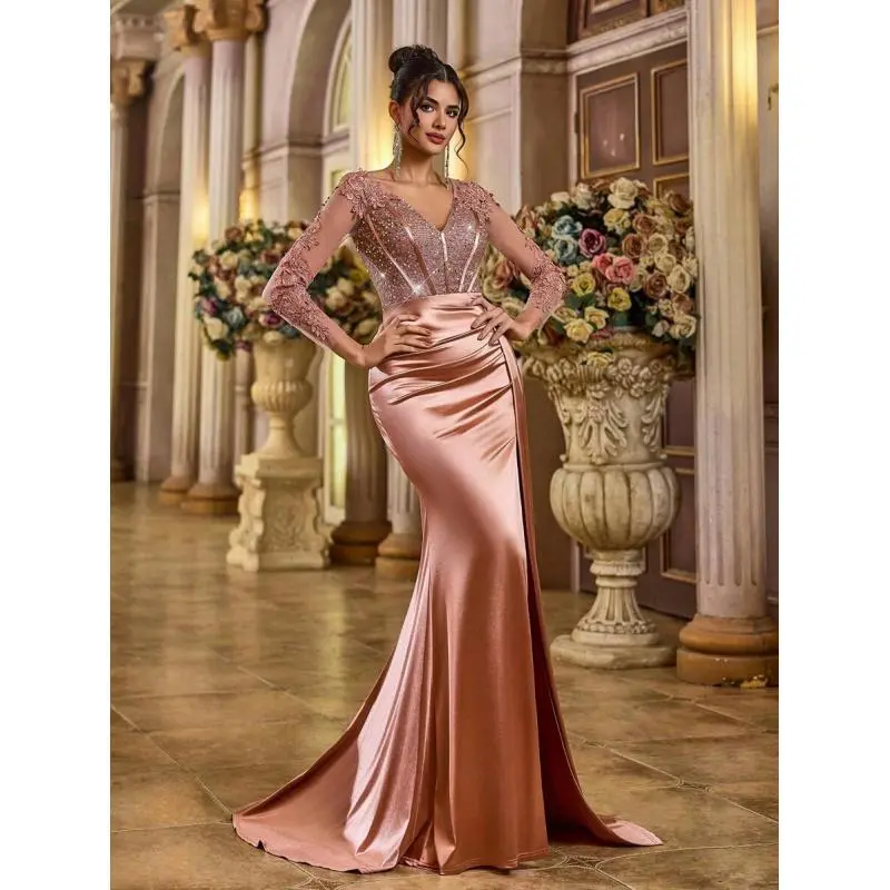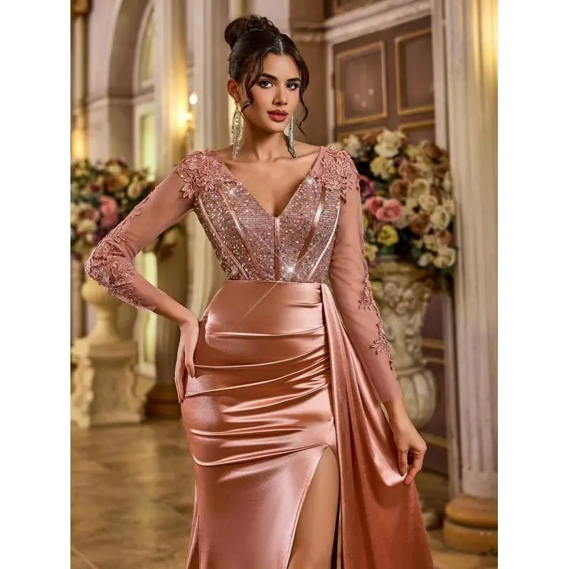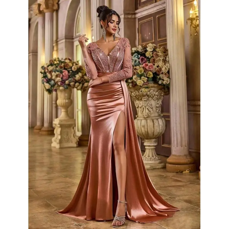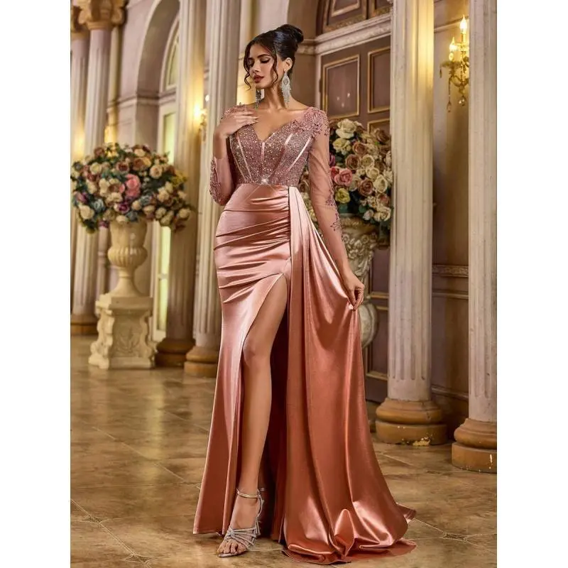 Neckline:V neck Occasion:Formal & Evening Sleeve Type:Regular Sleeve Hem Shaped:Slit Waist Line:High Waist Details:Contrast Sequin, Zipper, Split Thigh Lined For Added Warmth:No Pattern Type:Colorblock, Plain, All Over Print Body:Lined Color:Dusty Pink Style:Party Sleeve length: long sleeve Type:Fitted Fit Type:Regular Fit Length:Maxi Material:Woven Fabric Composition:95% Polyester, 5% Elastane Lining:100% Polyester Care Instructions:Hand wash,do not dry clean Sheer:No Fabric Elasticity:Slight Stretch