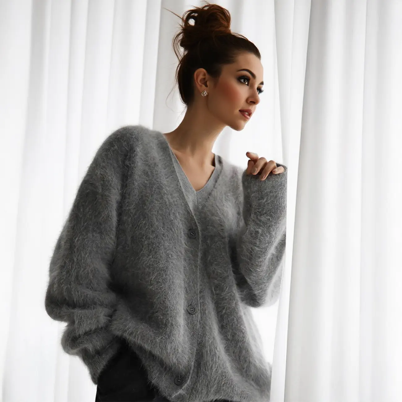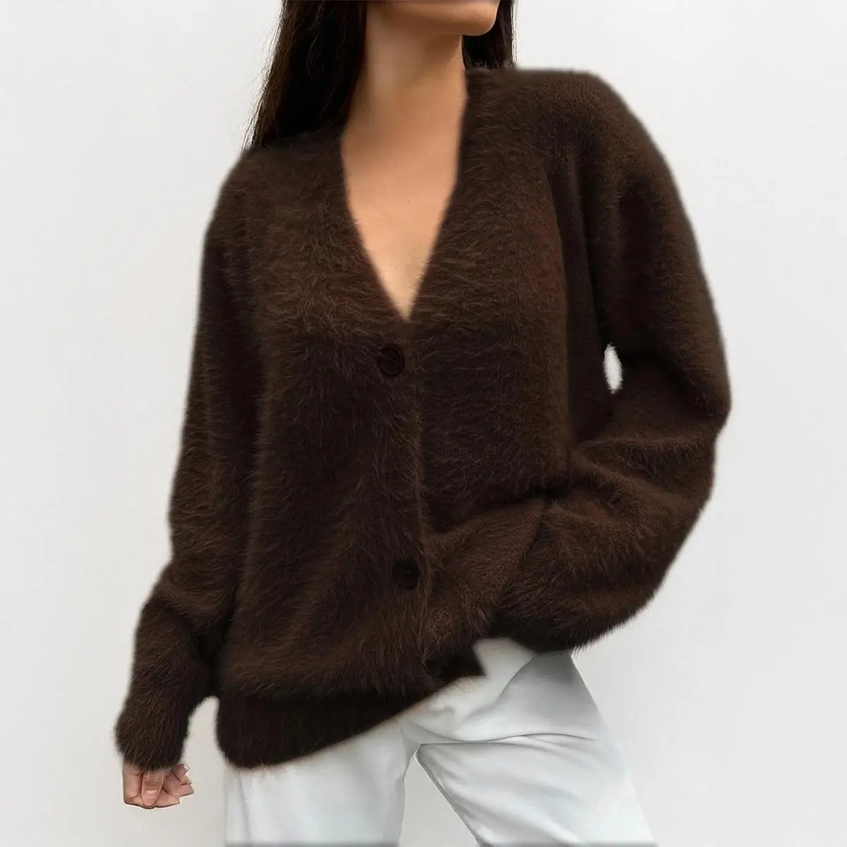 KatchMe Women's Elegant Solid Color V Neck Long Sleeve Faux Fur Button-Up Loose Cardigan
