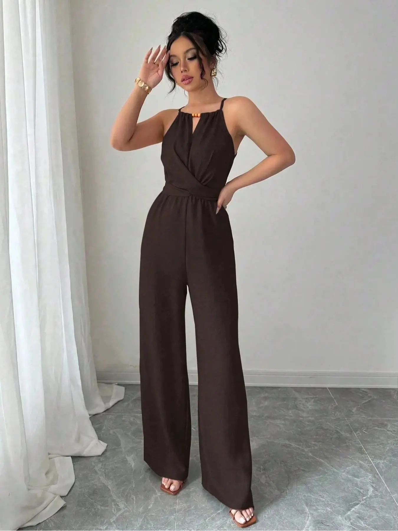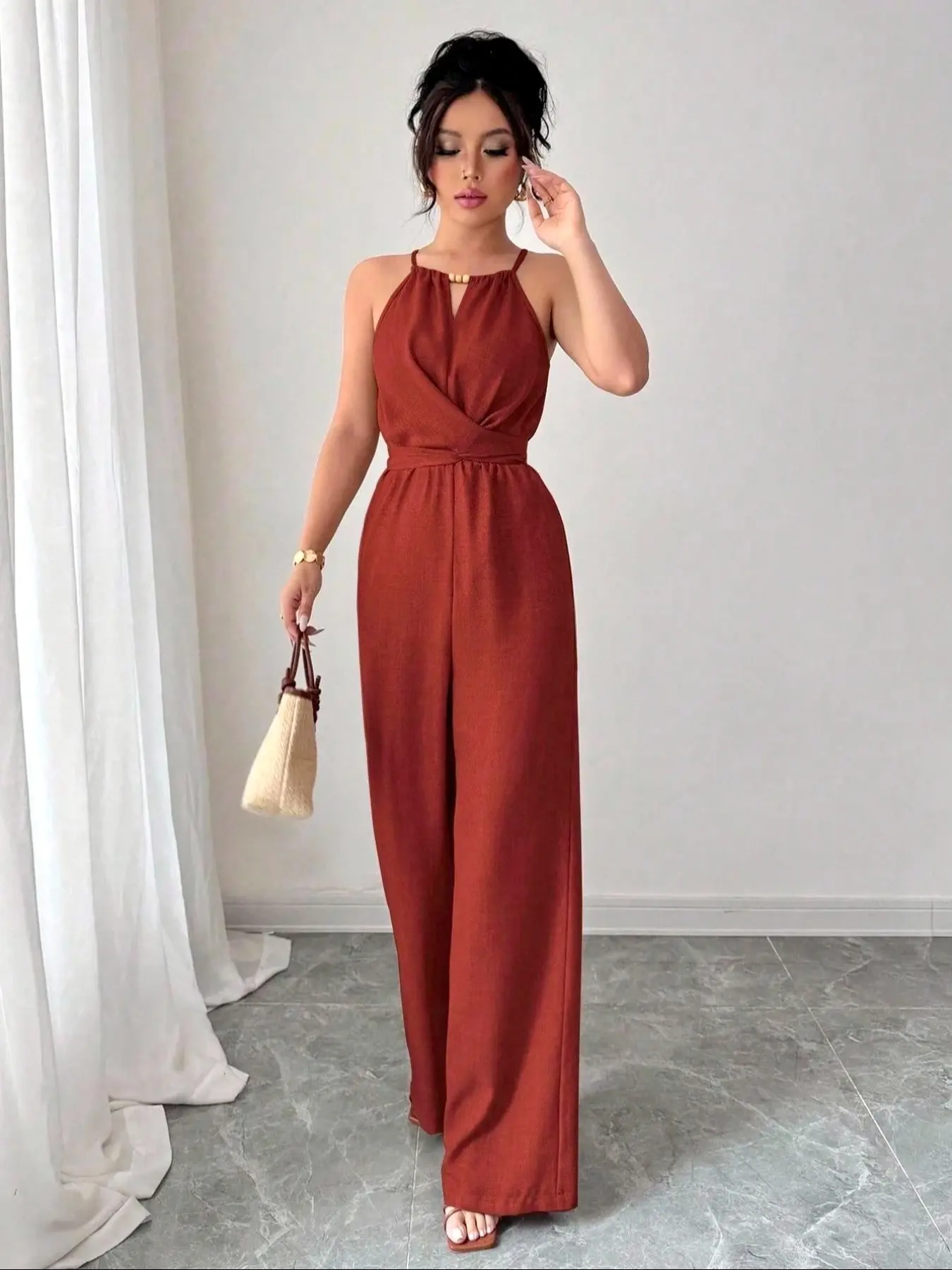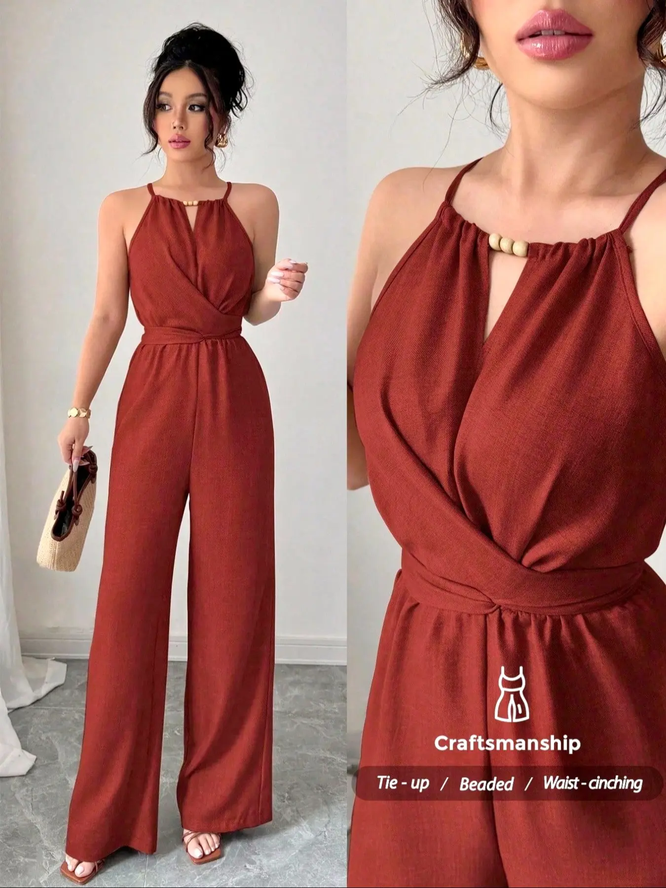 5. Elegant Women's Solid Color Beaded Jumpsuit, Womenswear, Perfect for Parties and Formal Occasions, Sleeveless Design for Layering