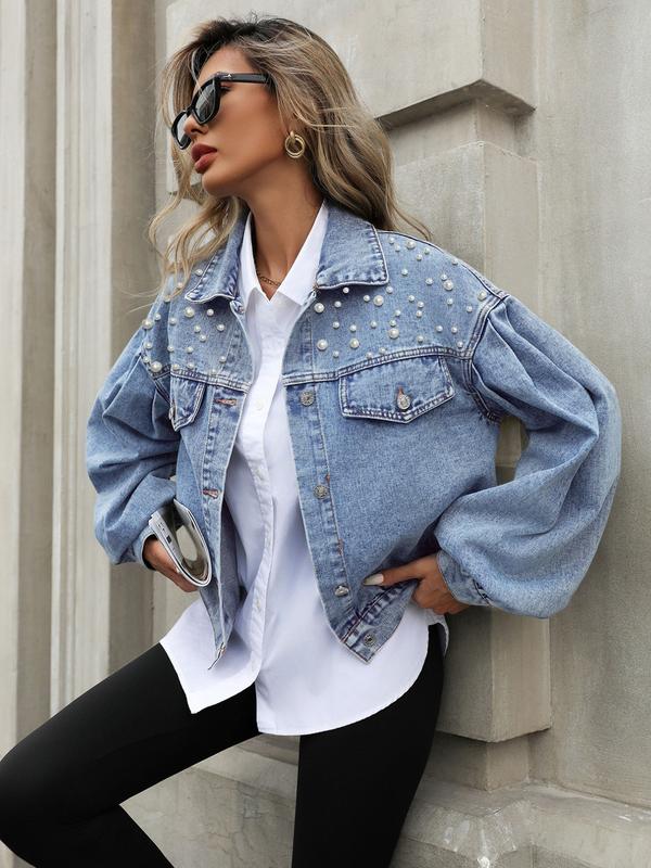 Elegant Fashion Women's Beaded Loose Fit Casual Denim Jacket, Stylish and Versatile Outerwear for Everyday WearElegant Fashion Women's Beaded Loose Fit Casual Denim Jacket, Stylish and Versatile Outerwear for Everyday Wear