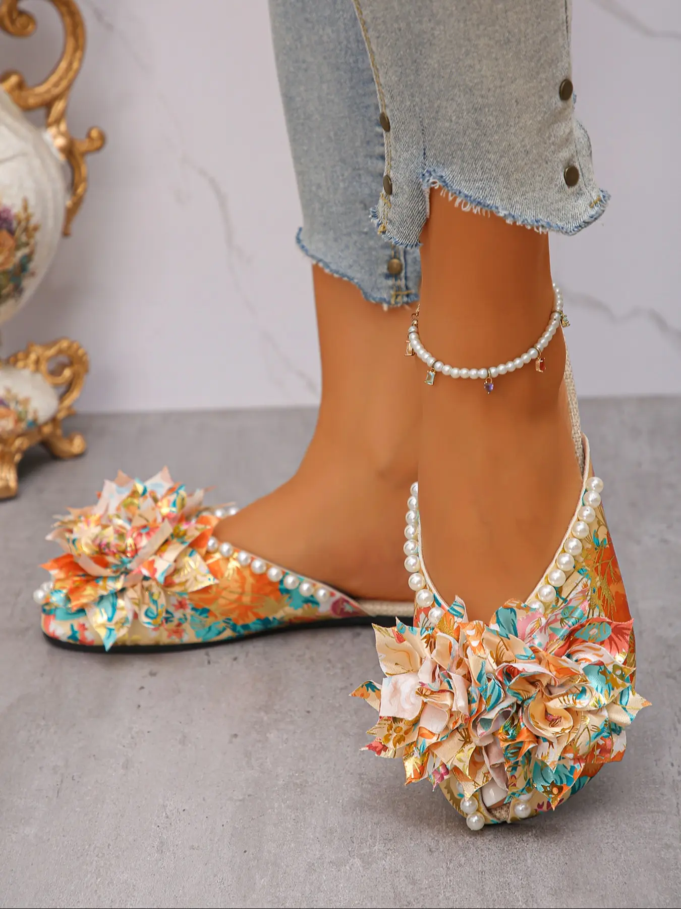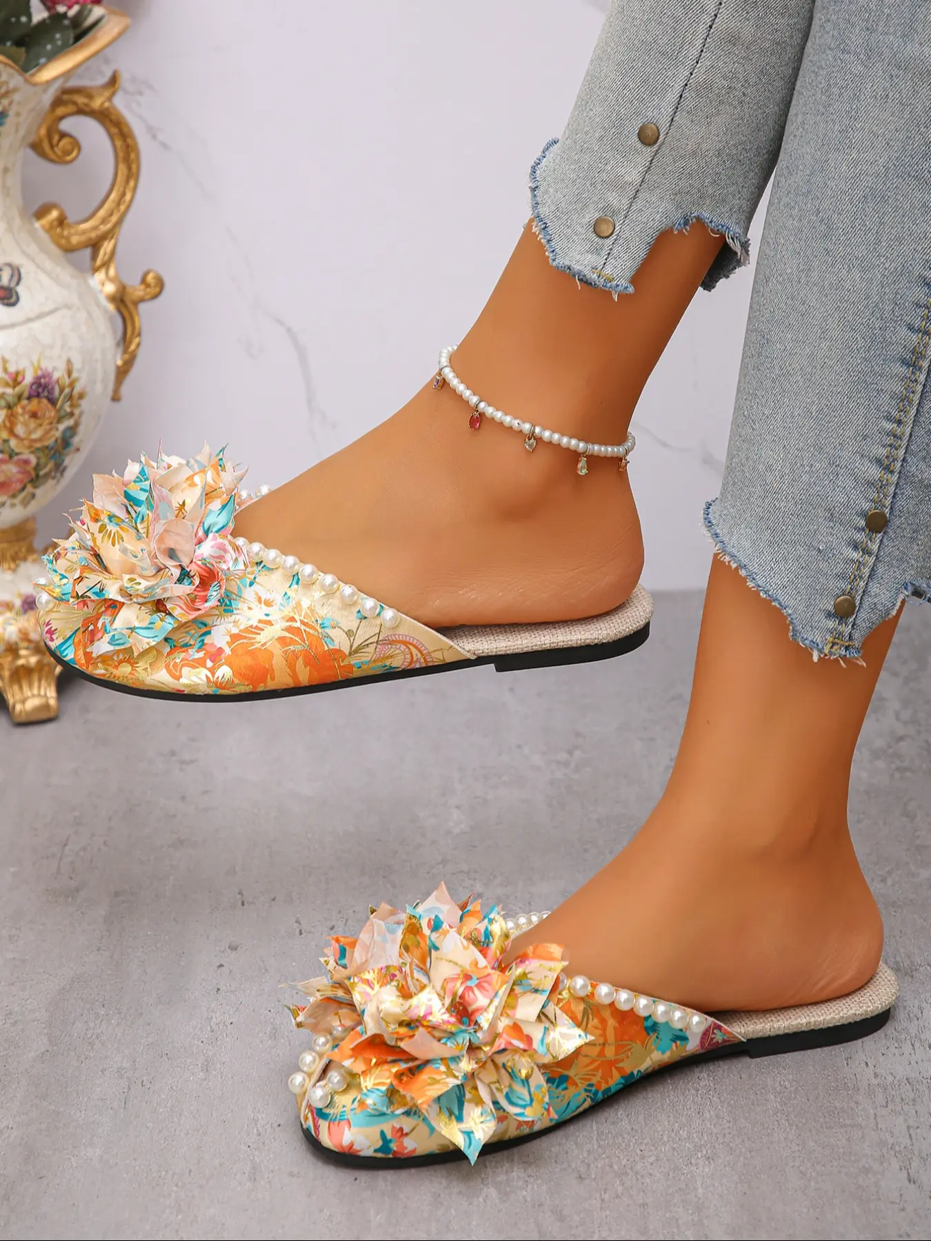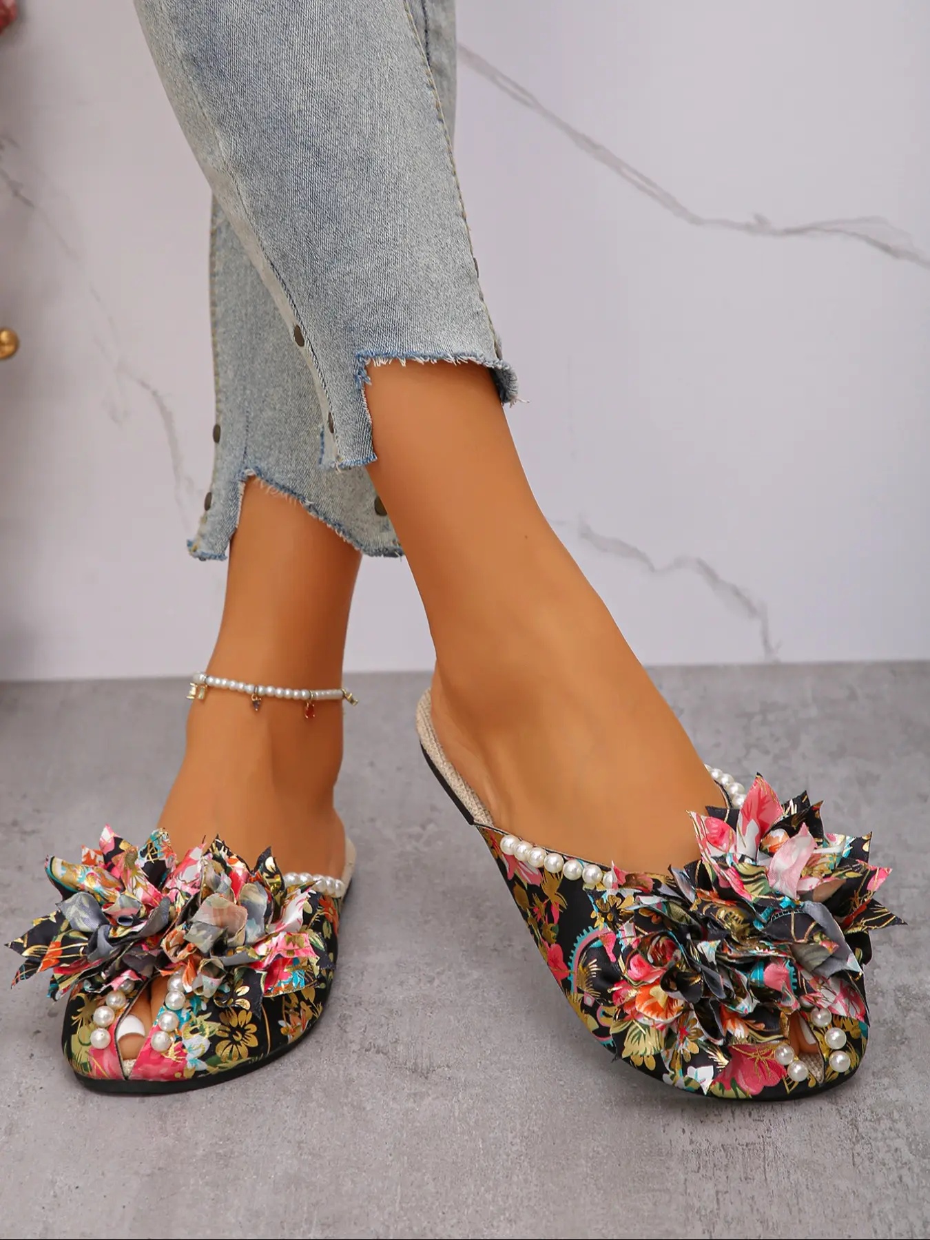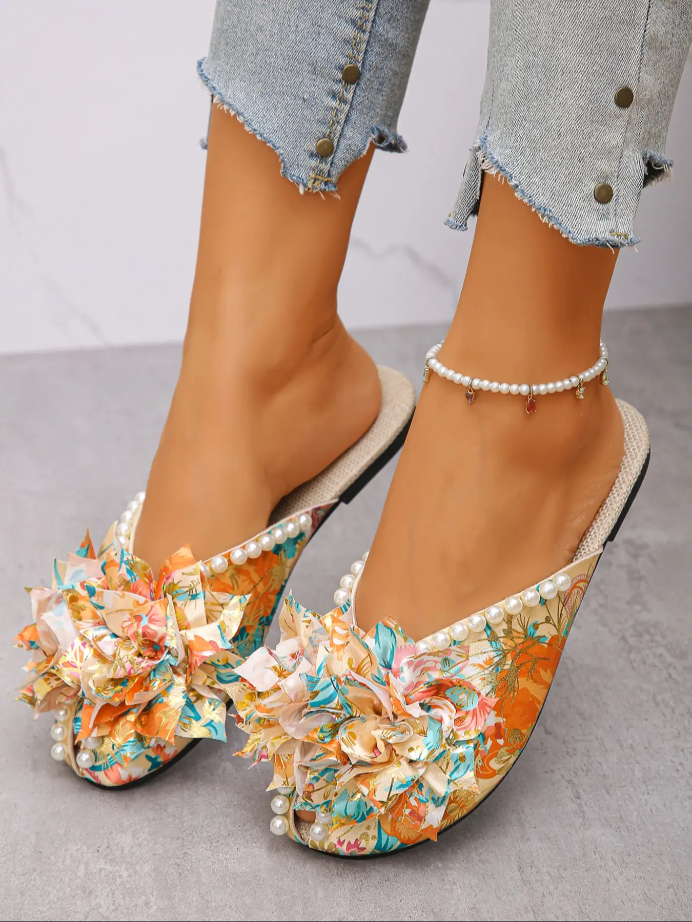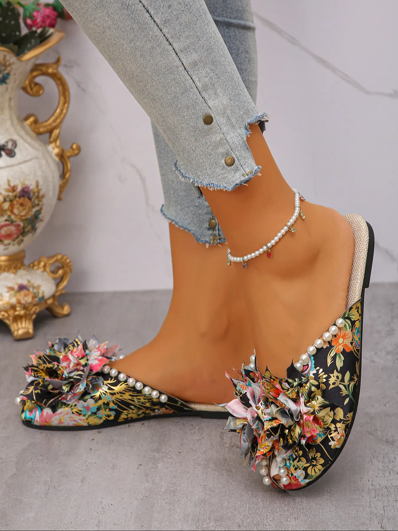 Elegant Women's Sandals with Cute Flower Decorations, Pearl Accents, Random Floral Prints, Round Toe Slip-Ons for Beach Vacation Office School