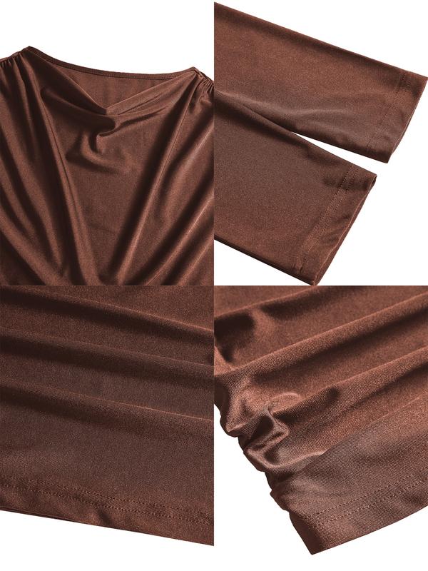 elegant women's two-piece set, fall & winter high waist ruched skirt, long sleeve round neck top, plain color, plus size fashion#plussize #elegant #ootd #fyp #foryoupage