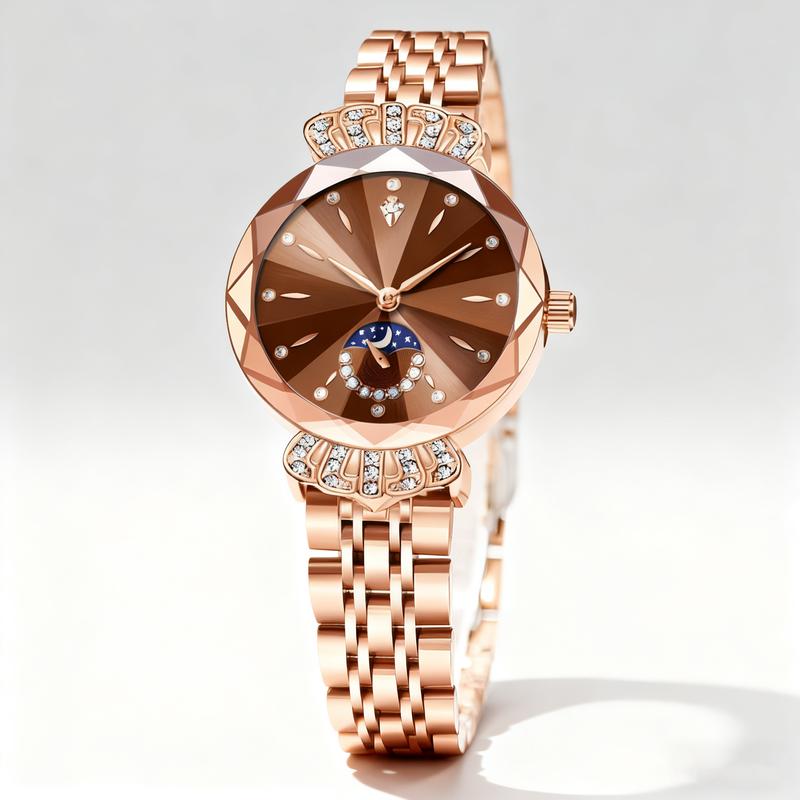[Mother's Day Gift] Elegant Women's Wristwatch with Moon Star Sun Dial, Faceted Crystal Accent, Stainless Steel Band, Anniversary Gift for Her