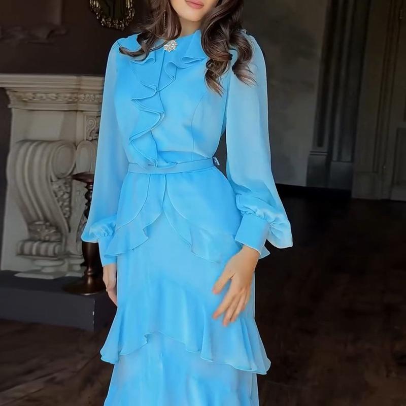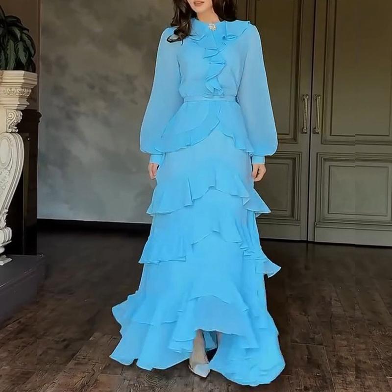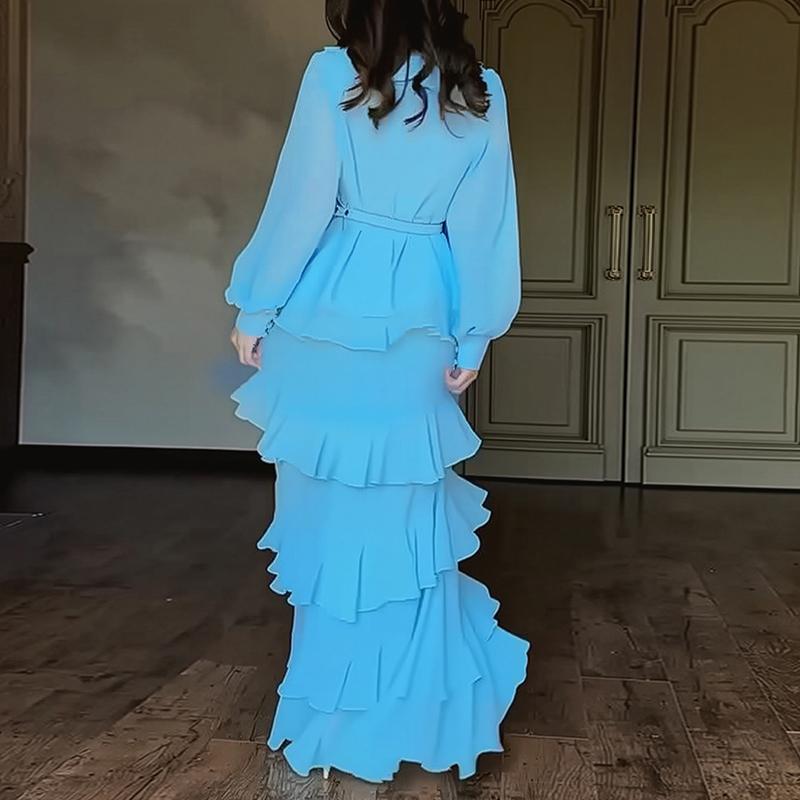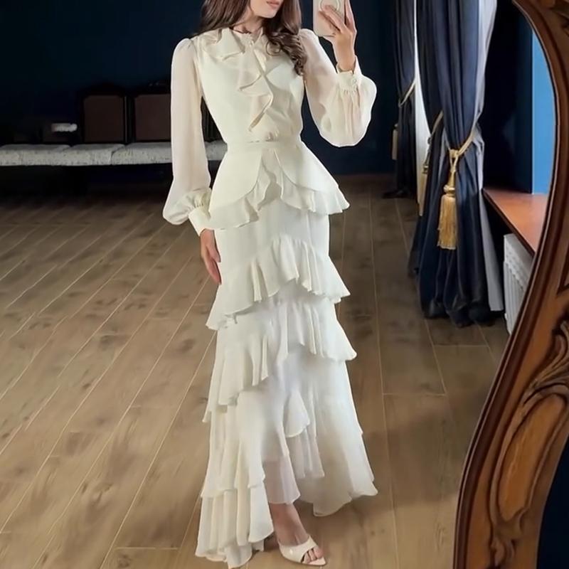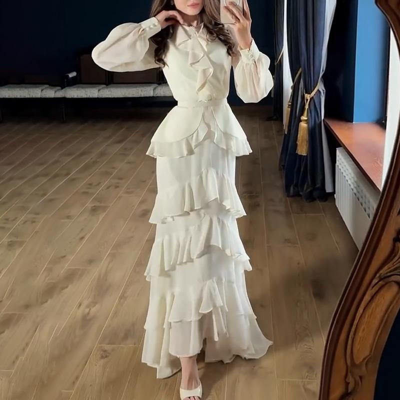 ·Layered ruffle trim – Cascading ruffles from neckline to hem create rich visual texture and soft, flowing movement.