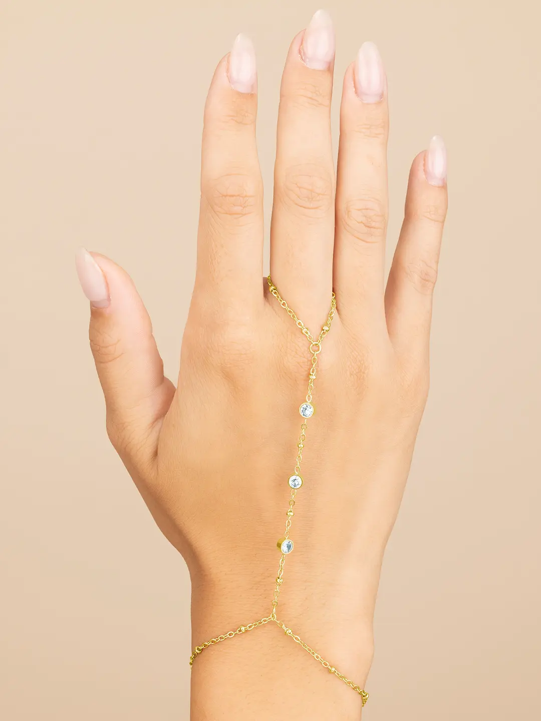 The kind of statement that whispers. This delicate hand chain wraps from finger to wrist with bezel-set CZs that catch the light at every gesture. Designed for days when your jewelry speaks before you do.