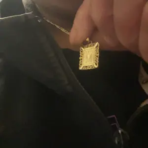 Shiny and has yet to tarnish. The chain came not as pictured and the monogram is barely visible but I’m not mad at em. My daughter’s chain already broke.