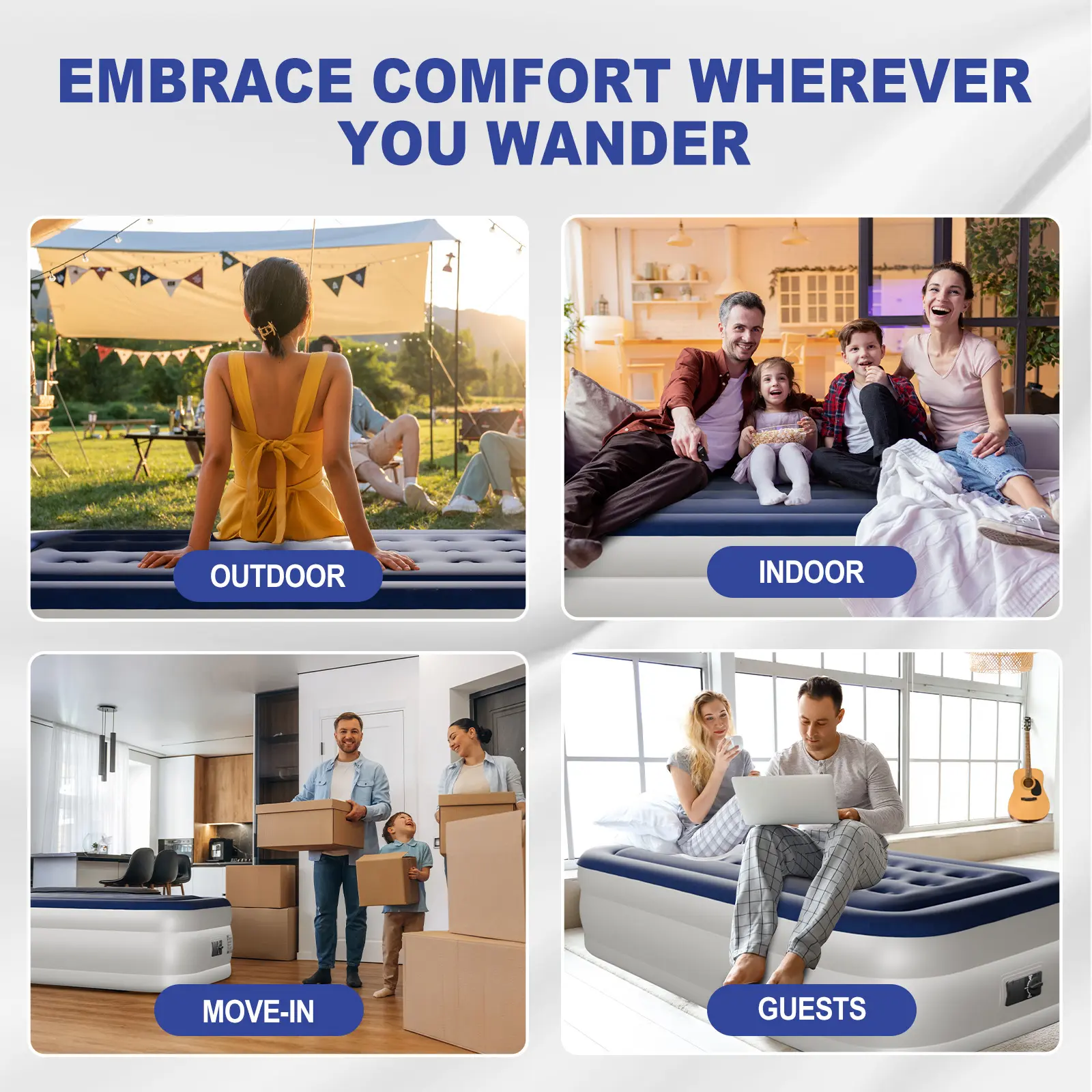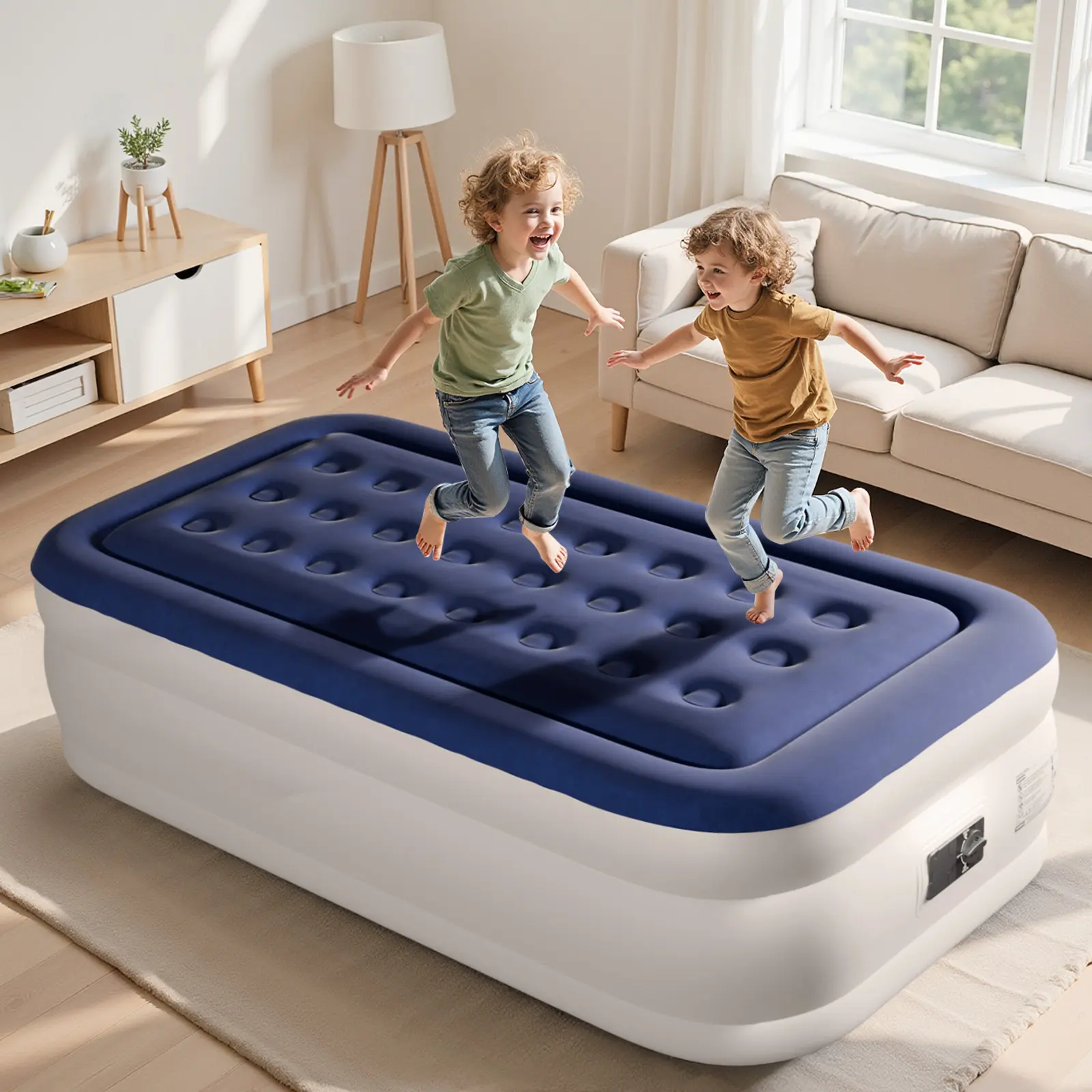 1. Quick 4-Minute Setup with Built-in Pump: No more waiting around—this queen air mattress inflates and deflates in just 4 minutes using the built-in electric pump with separate inflate/deflate controls, saving time and effort.