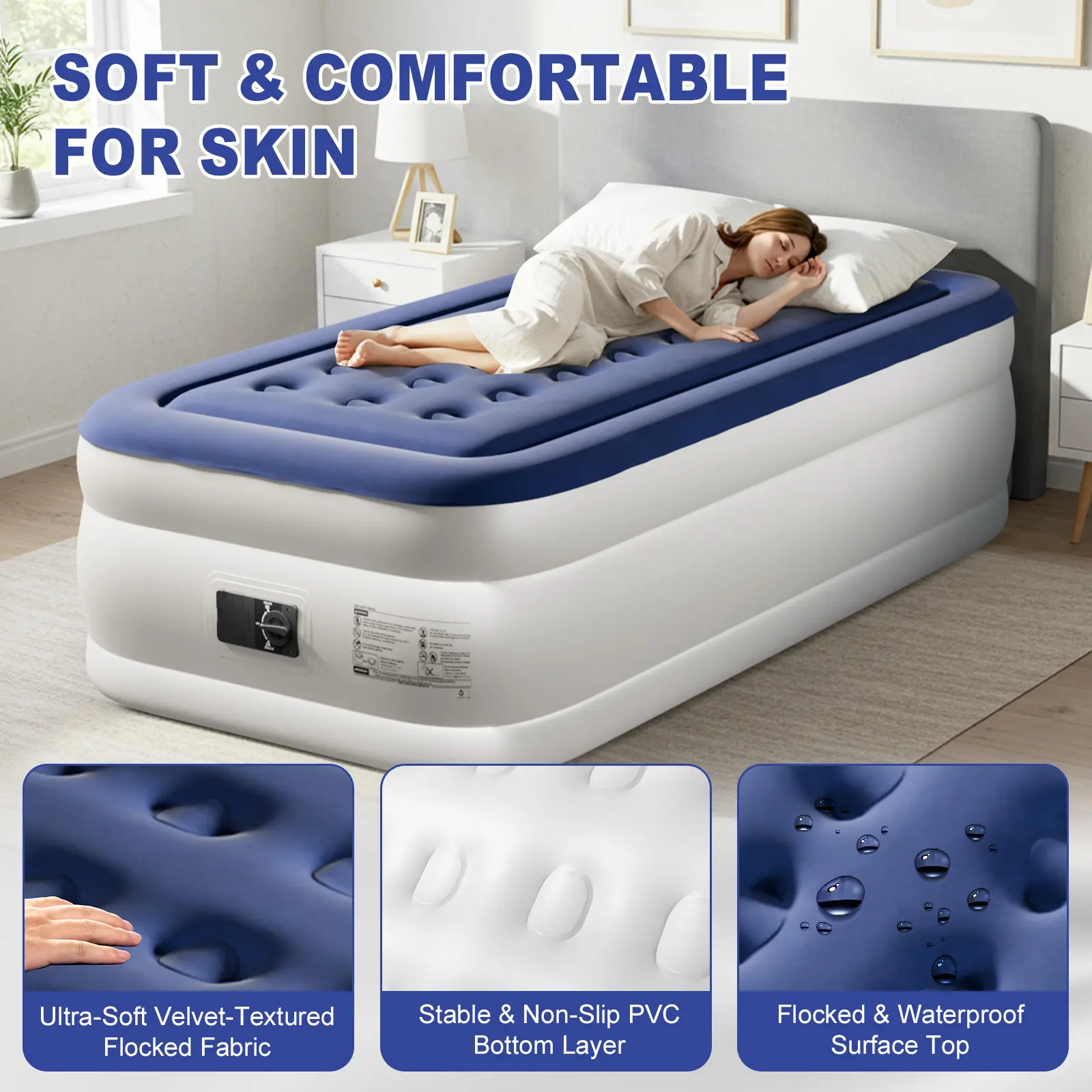 3. Luxurious Flocked Top & Anti-Slip Bottom: The soft flocked surface delivers a cozy, velvety feel while resisting punctures and abrasions. The anti-slip bottom keeps the mattress quiet and securely in place all night long.