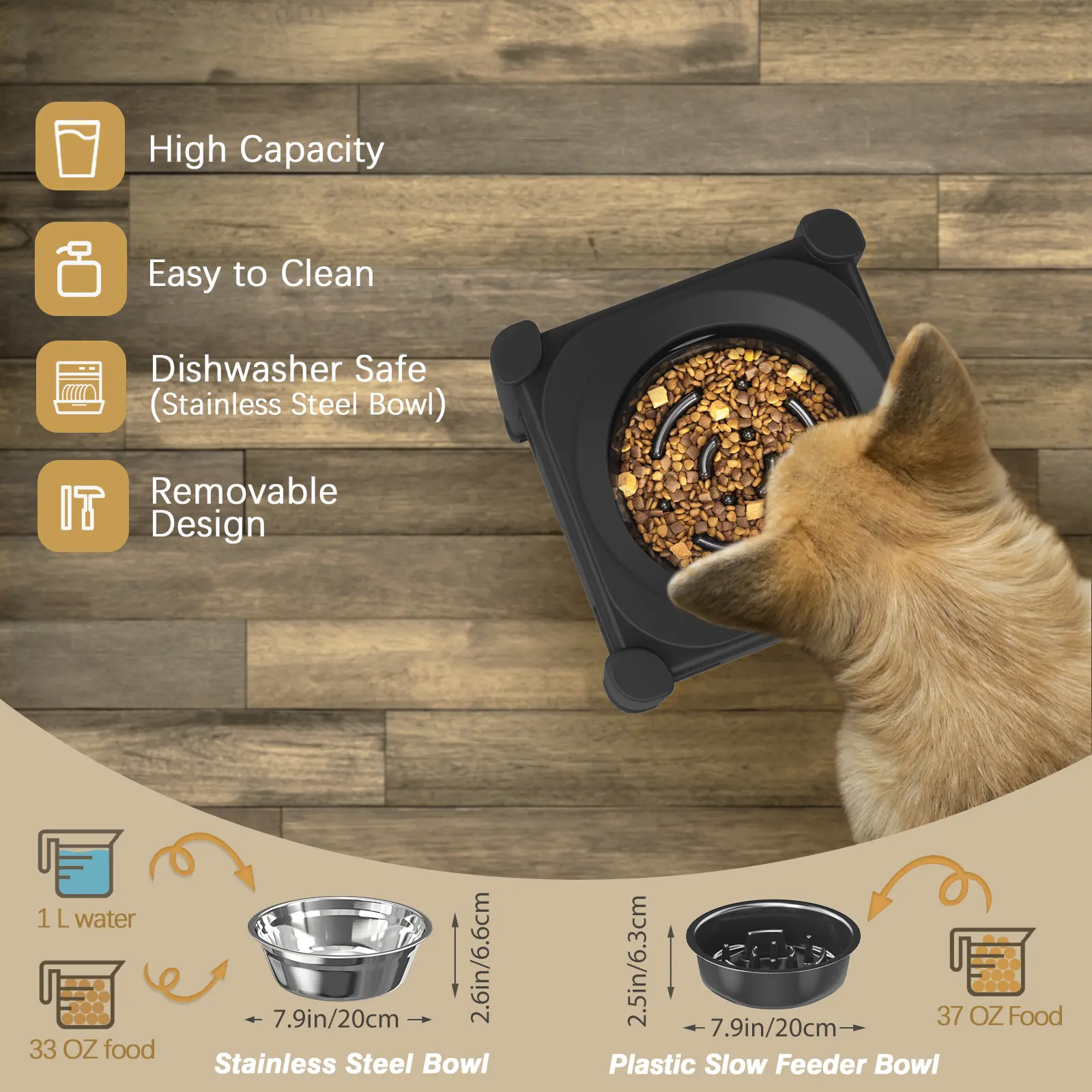 I love how it comes with a slow feeder and a regular stainless steel dish easy to raise and lower love it