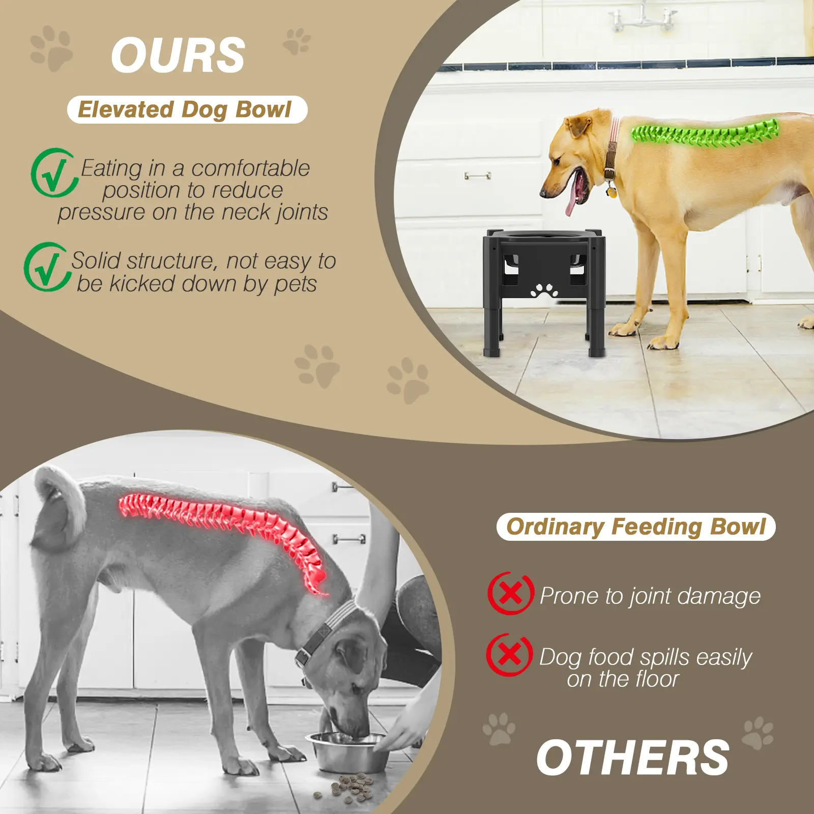 We had another brand I had matching ones for both of our dogs, but my smaller dog had a hard time because the legs didn’t go short enough for her. This one is great because it’s a lot more versatile. It goes up higher and down lower than the other brand. I like that it is one bowl instead of two also because we have a big water station for all of our pets. I only needed one bowl for the food