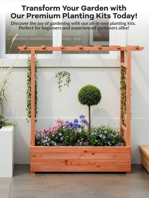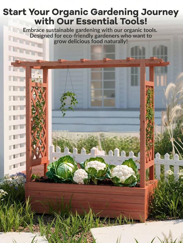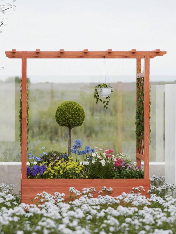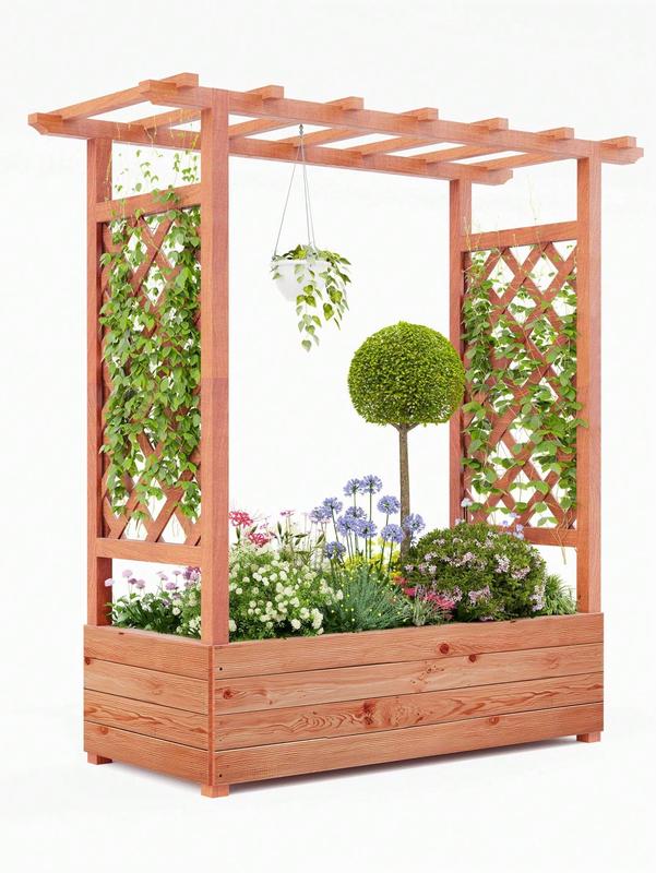 1 All in One Gardening Solution with Trellis & Planter: This innovative raised garden bed features a spacious planting area for vegetables, herbs, and flowers, complete with an integrated hanging roof trellis and dual side trellises. Perfect for climbing plants like tomatoes, cucumbers, or flowering vines, it also includes side supports and a decorative hanging roof for lights or baskets. The elevated design combines practicality with aesthetic appeal, creating a beautiful and functional gardeni