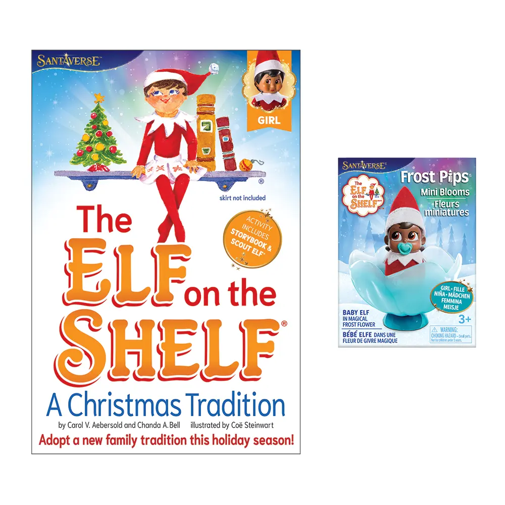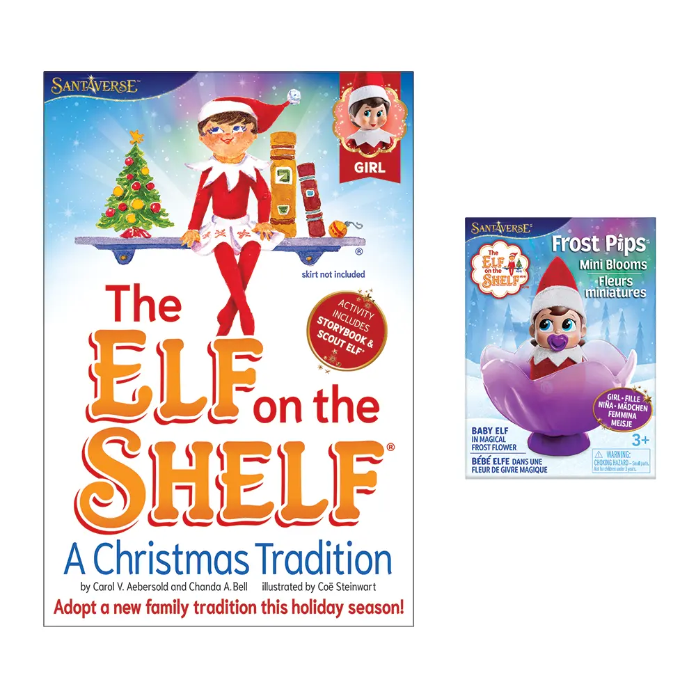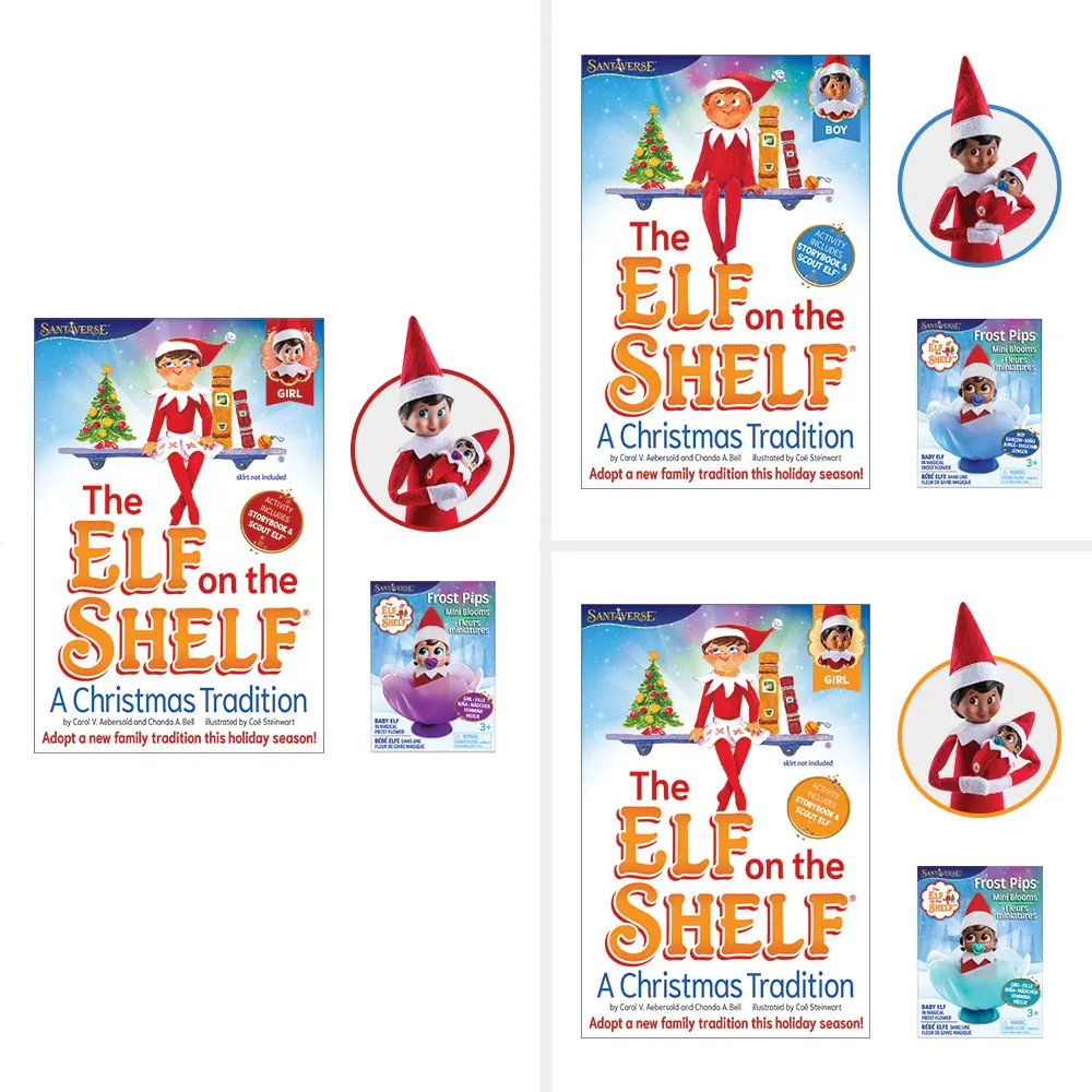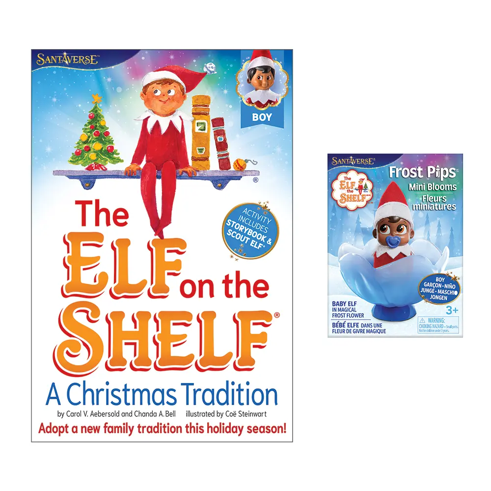 Meet your Elf family in one magical bundle! The Elf on the Shelf Family Bundle brings together a classic Scout Elf Box Set and an adorable Frost Pips Mini Bloom Elf Baby with matching eye color — a perfect pairing straight from the Elf on the Shelf Santaverse. Start or grow your family’s tradition with this sweet duo that celebrates love, laughter, and the spirit of Christmas. Display them side-by-side for a daily dose of North Pole joy! Includes: The Elf on the Shelf: A Christmas Tradition Box Set – adoptable Scout Elf, storybook, keepsake box & official adoption certificate Matching Frost Pips Mini Bloom Elf Baby –  same eye color and gender as your Scout Elf Bring home double the magic this season with the official Santaverse Family Bundle that makes every morning merry and bright.