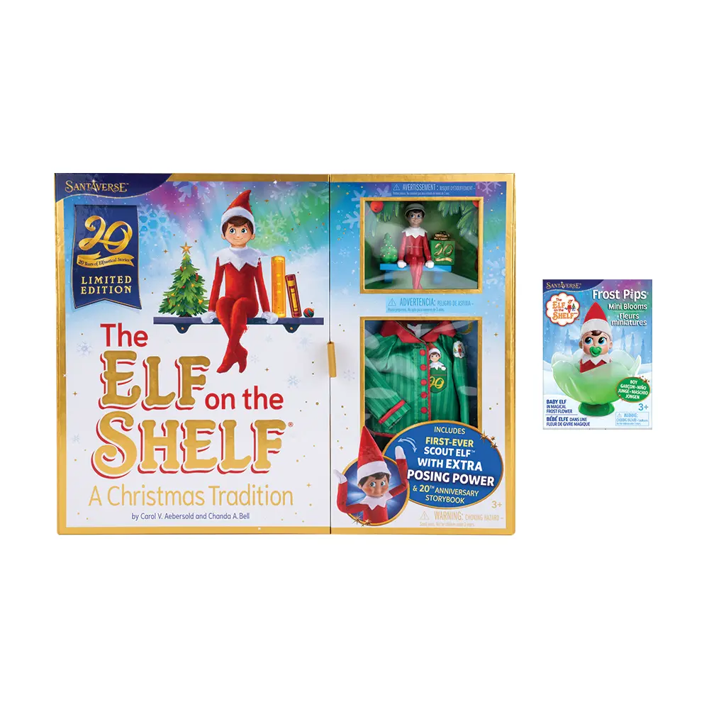 The Elf on the Shelf and Frost Pips Anniversary Bundle brings together a Blue-Eyed Boy Scout Elf and a matching Frost Pips Mini Bloom Elf Baby, straight from the Elf on the Shelf Santaverse.