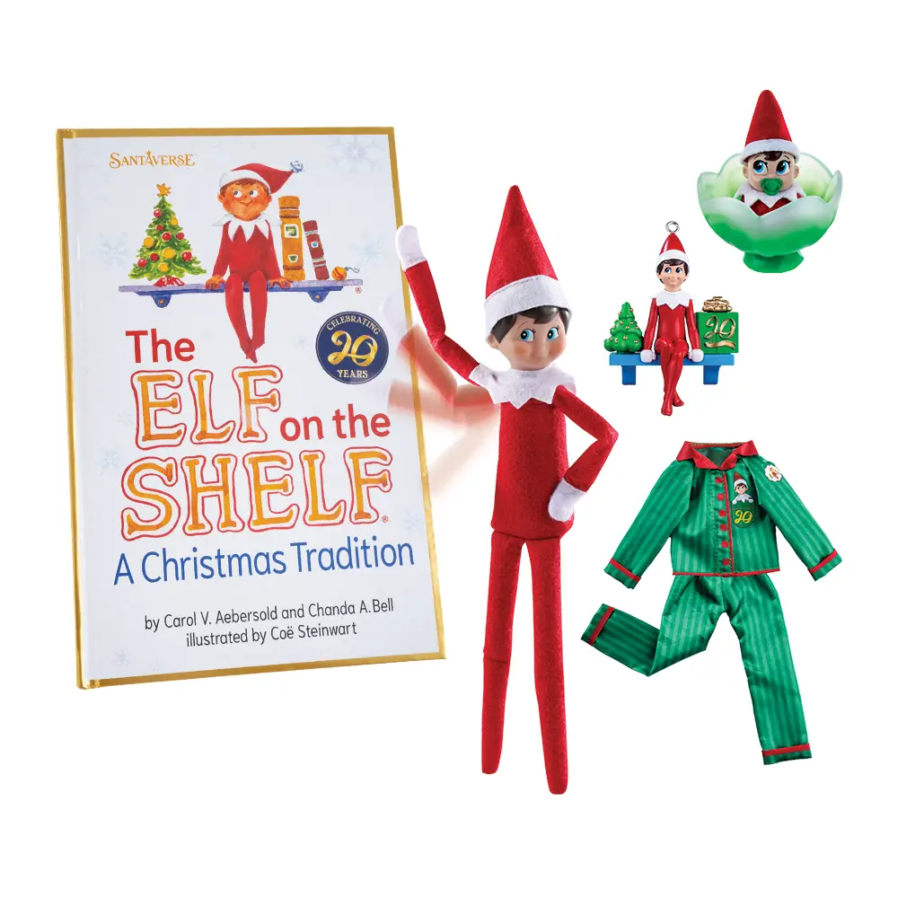 The Elf on the Shelf: A Christmas Tradition 20th Anniversary Deluxe Box Set – Poseable Scout Elf boy with blue eyes, storybook, limited-edition ornament, and elf pajamas