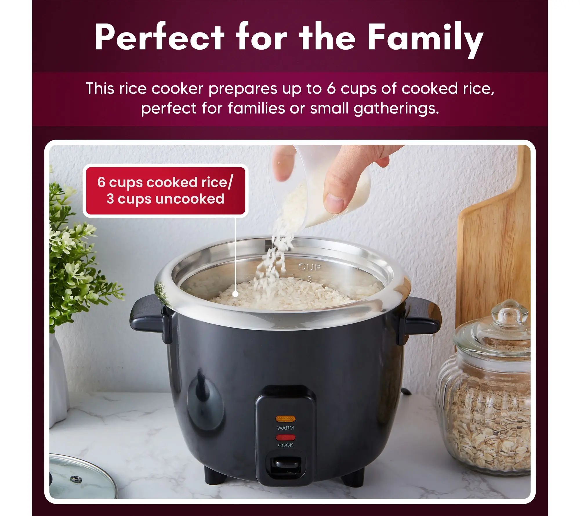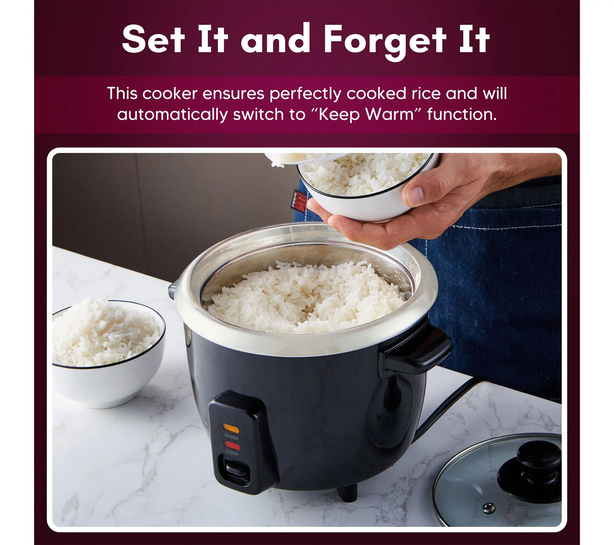 From weeknight dinners to family gatherings, this 6-cup rice cooker brings effortless meal prep to your kitchen. Just add your ingredients -- rice, soup, oatmeal, or chili -- and let the appliance handle the rest, automatically switching to Keep Warm so every dish stays ready to serve. Cool-touch handles and a tempered glass lid make cooking and serving safe and simple. From Elite Cuisine.