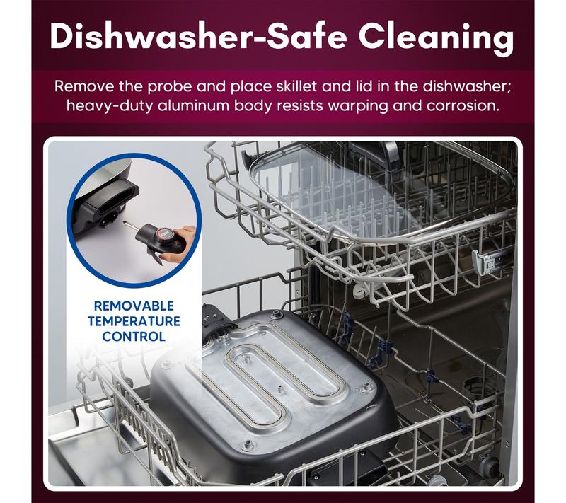 ·Glass lid and skillet body (with temperature control probe removed) are dishwasher safe (top rack only)