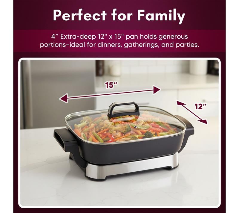 ·High 3.05 side walls and clear tempered glass lid minimize splatter and seal in flavor