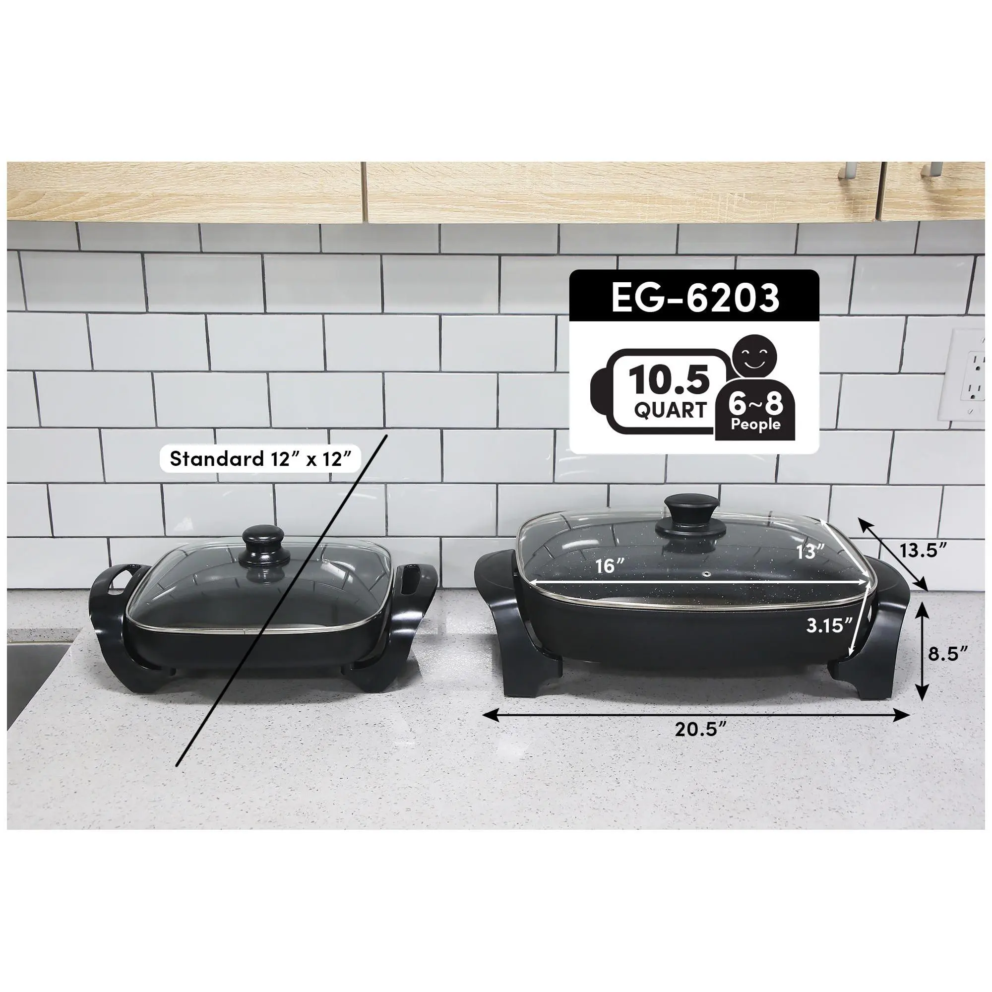 The skillet exceeds my expectations. The quality is excellent. It was s large, deep and the finish is great! Packaged well and came with the lid and heating element. I am beyond pleased!