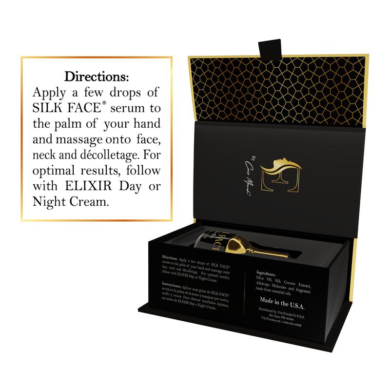 This kit includes Elixir 44 Day Cream, Elixir 44 Night Cream, and Silk Face Serum — a complete beauty set for radiant skin.