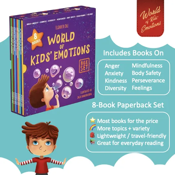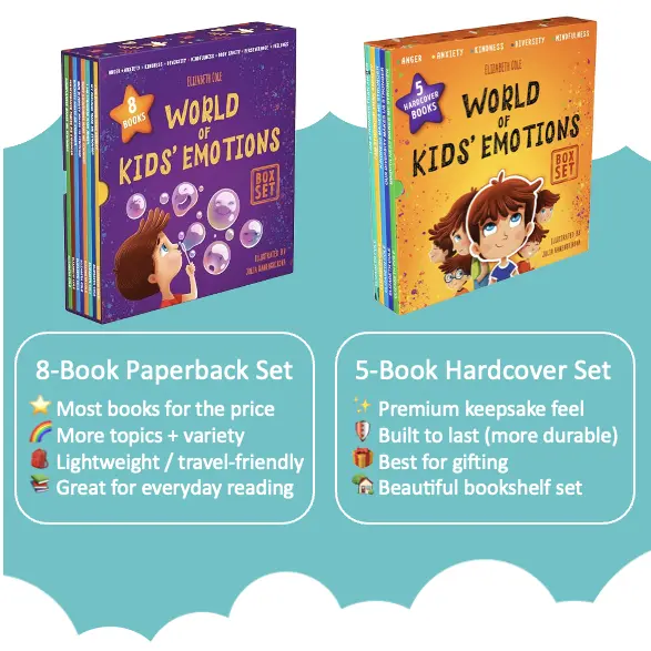 Help kids (ages 3–7) understand, name, and manage big feelings through playful, relatable stories designed for Social Emotional Learning (SEL). Now available in two box set options—choose the format (and topics) that fit your family best: