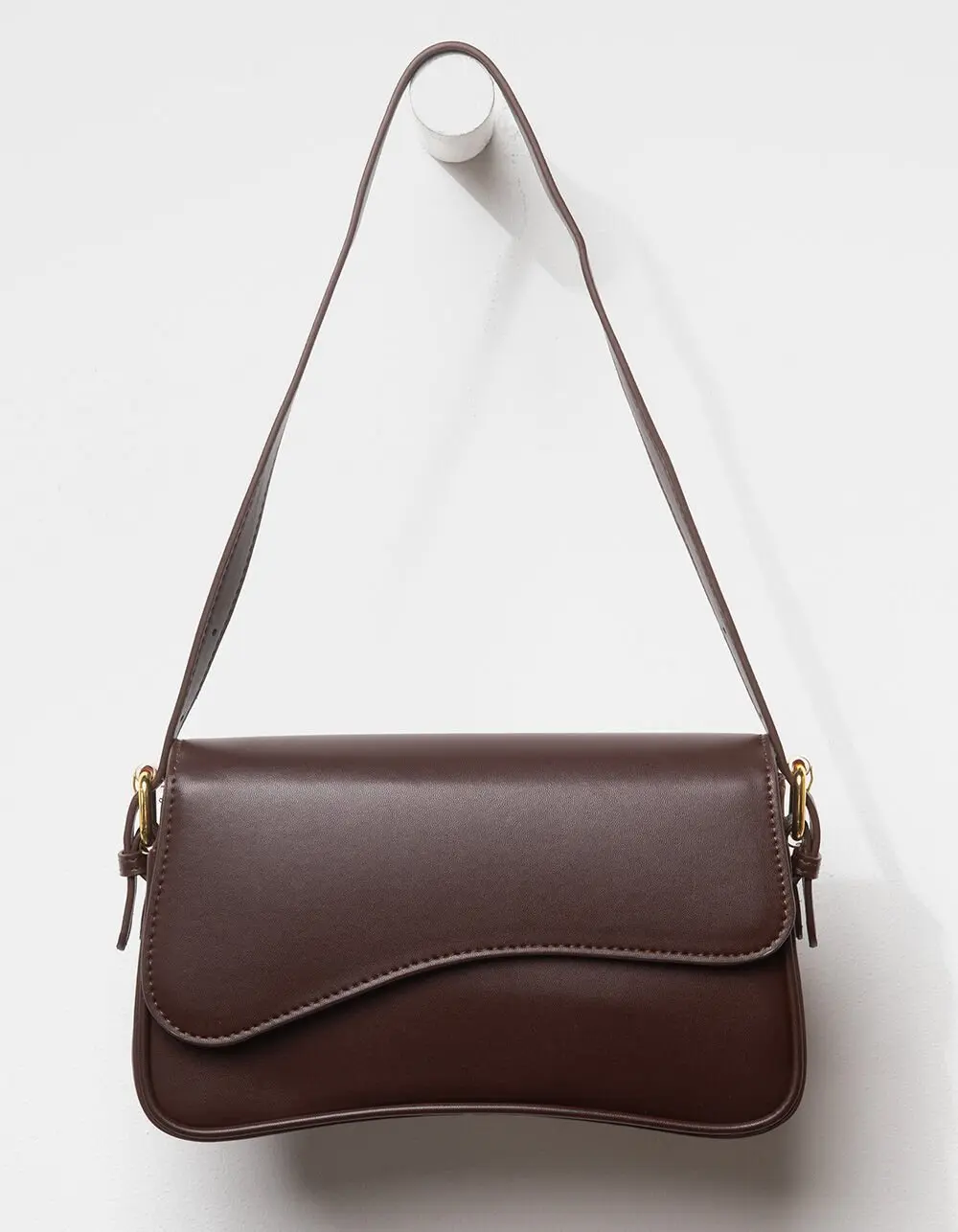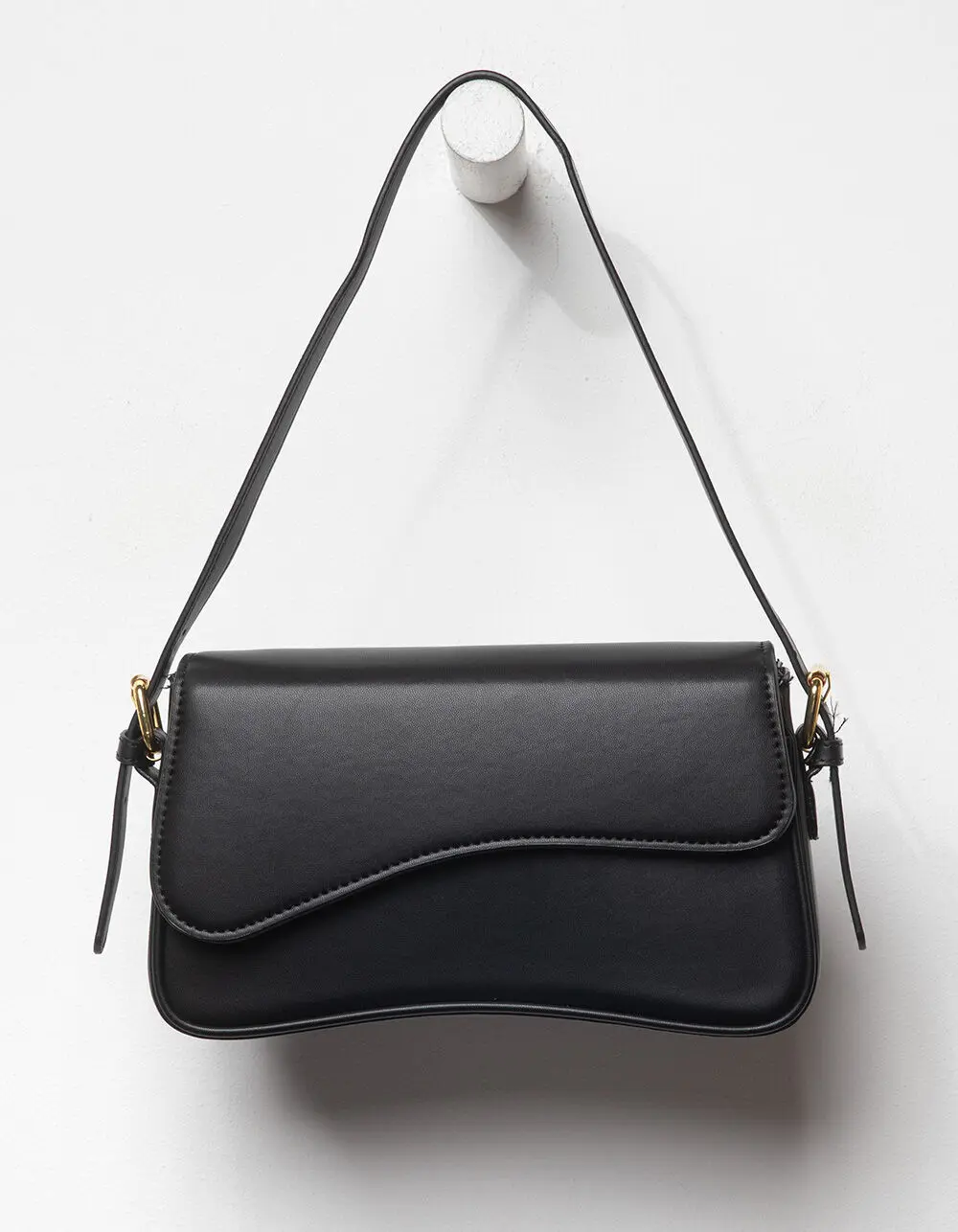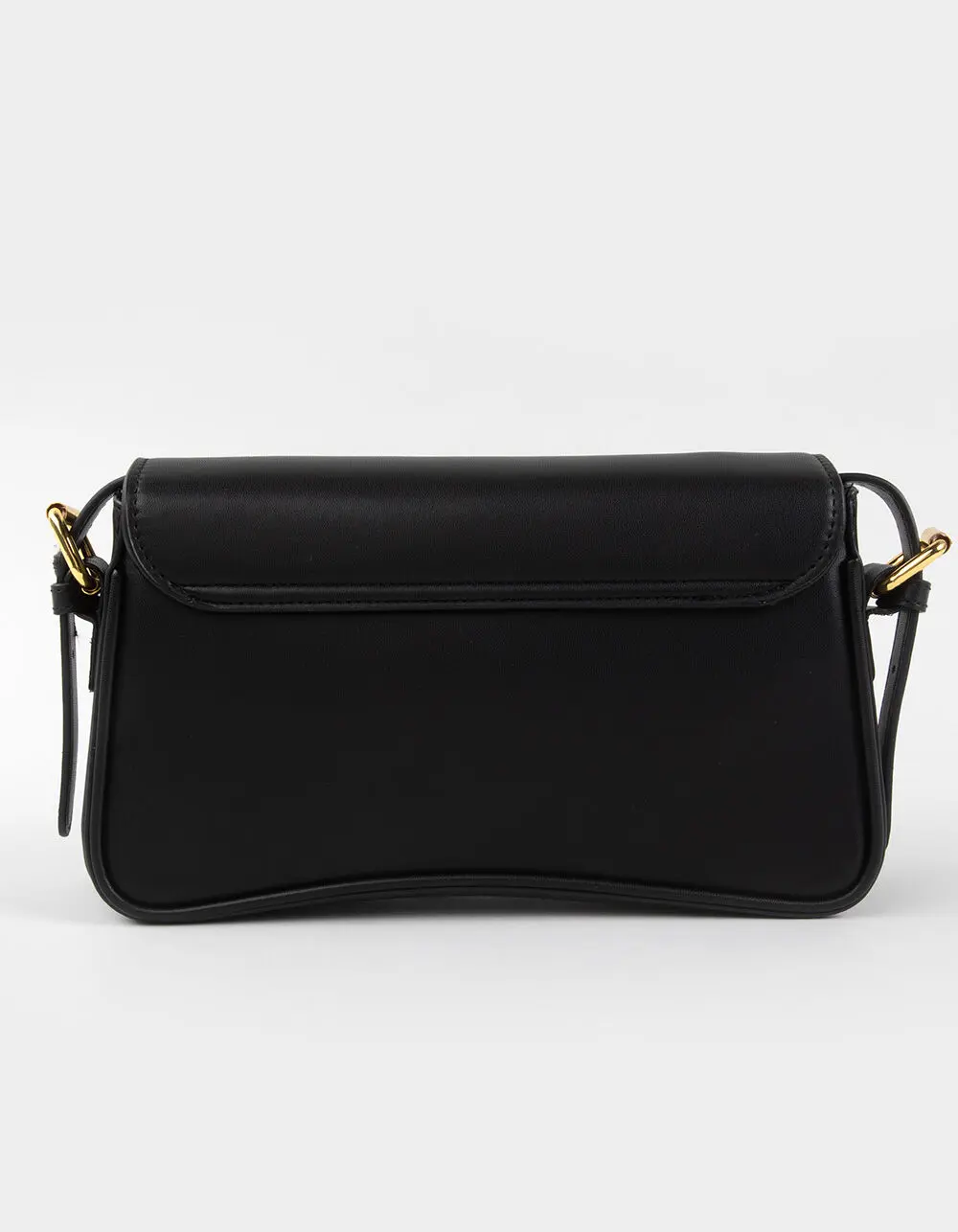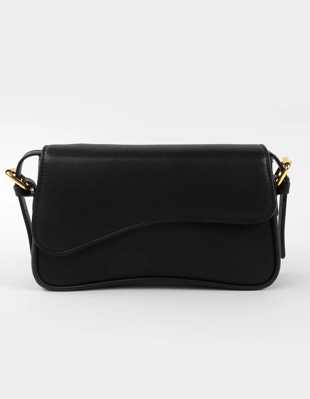 Elle Retro Shoulder Bag. The Elle Retro Shoulder Bag brings a touch of vintage charm to modern style. Crafted from solid black faux leather, this sleek and structured bag features a unique flap closure with dual snap buttons layered over a secure zip closure for added protection. The belt-style shoulder strap adds a classic, retro-inspired detail and offers an adjustable length for a custom fit. Inside, you'll find a zippered interior pocket to keep your essentials organized and within easy reach. With approximate dimensions of 9in x 5in x 2.5in, the Elle bag is perfectly sized for everyday use while adding a timeless edge to any outfit. Polyurethane shell with polyester lining. Imported.     CALIFORNIA PROPOSITION 65 WARNING: This product can expose you to chemicals, including lead which is known to the State of California to cause cancer or birth defects or other reproductive harm. For more information go to www.P65Warnings. ca. gov.