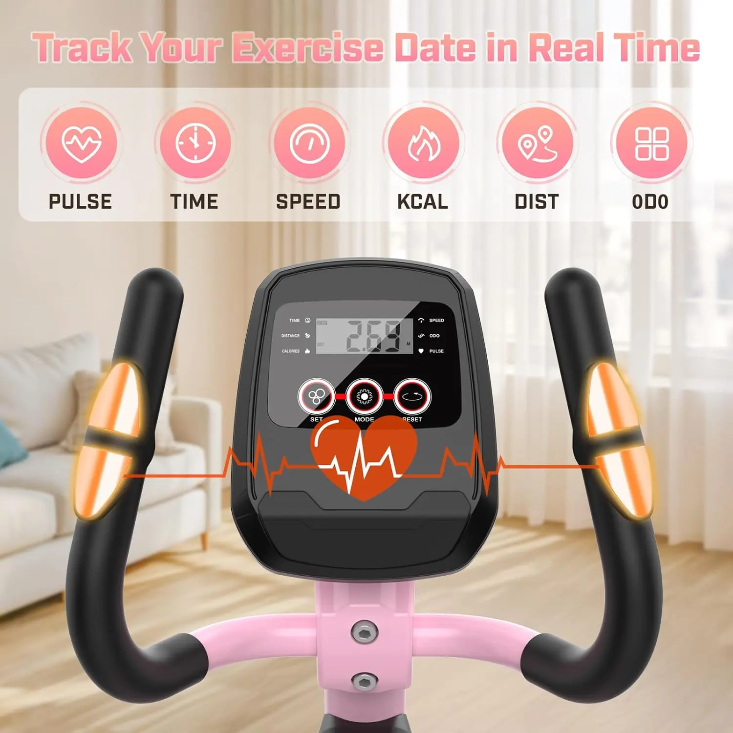 Easy-read display shows TIME, SPEED, DISTANCE, CALORIES, PULSE. Track your progress and stay motivated with clear stats.