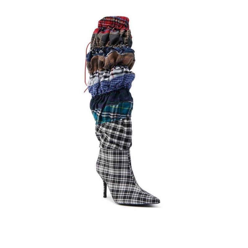 Pretty in punk! The AZALEA WANG Elodie Multi Boxer Boot is a stand-out style crafted from a variety of patchworked plaid textiles. It features a slouchy knee-high silhouette with an adjustable, elasticized shaft opening, a sharply-pointed toe, a short stiletto heel, and a pull-on fit. Style with distressed denim shorts and a sleek leather jacket for a look that’s plaid to the bone. - Textile Upper - Pointed Toe- Stiletto Heel- Knee-High Shaft- Stretchy- Imported (all measurements approximate from size 7.5)- 3.75” Heel Height- 21.5” Shaft Height- 16” Shaft Opening Circumference (Adjustable)- 14” Calf Circumference Product ID: 1037794