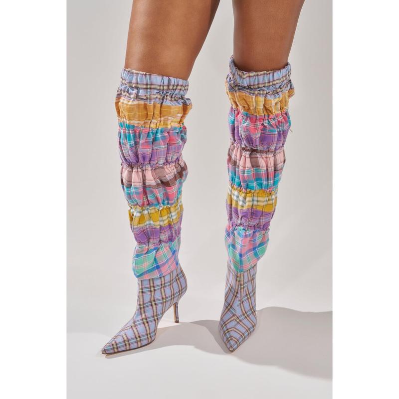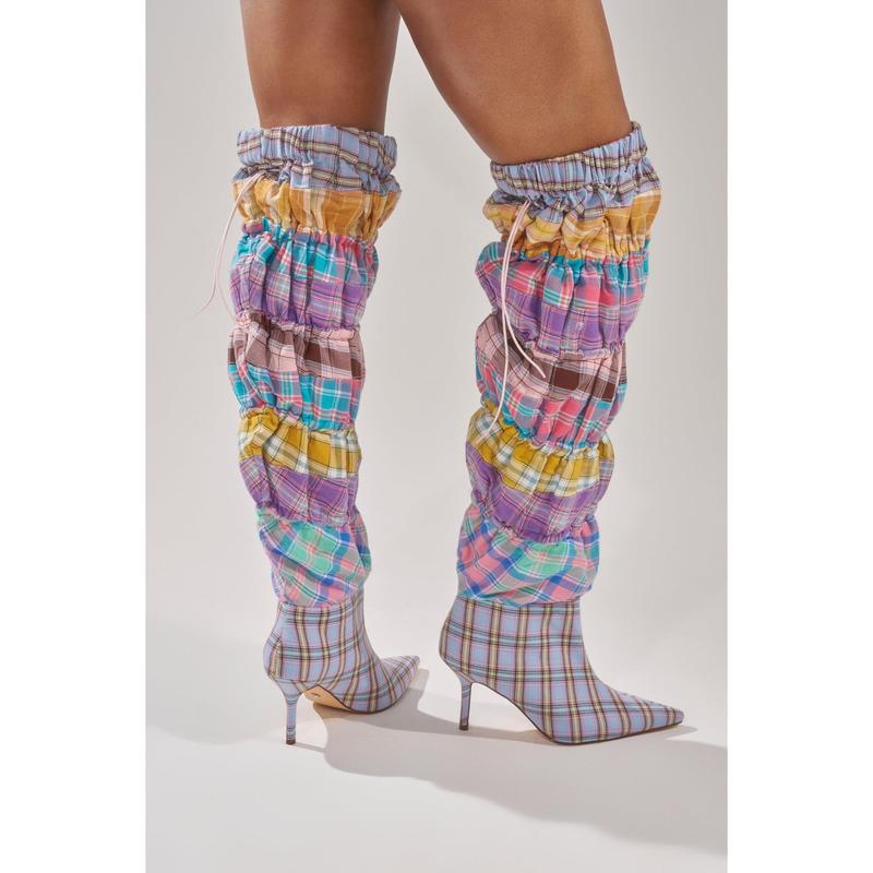 Live colorfully in The AZALEA WANG Elodie Pink Multi Boxer Boot. This knee-high knock-out features a patchwork of ruched pastel plaids, a pointed toe, and a slim stiletto heel. Complete with a slouchy, stretchy shaft and adjustable drawstring top. Perfect for standing out at festivals, parties, or anywhere bold style is required.- Textile Upper- Pointed Toe- Stiletto Heel- Knee-High Shaft- Stretchy- Imported(all measurements approximate from size 7.5)- 3.75” Heel Height- 19.5” Shaft Height- 18” Shaft Opening Circumference- 12” Calf CircumferenceProduct ID: 1054283