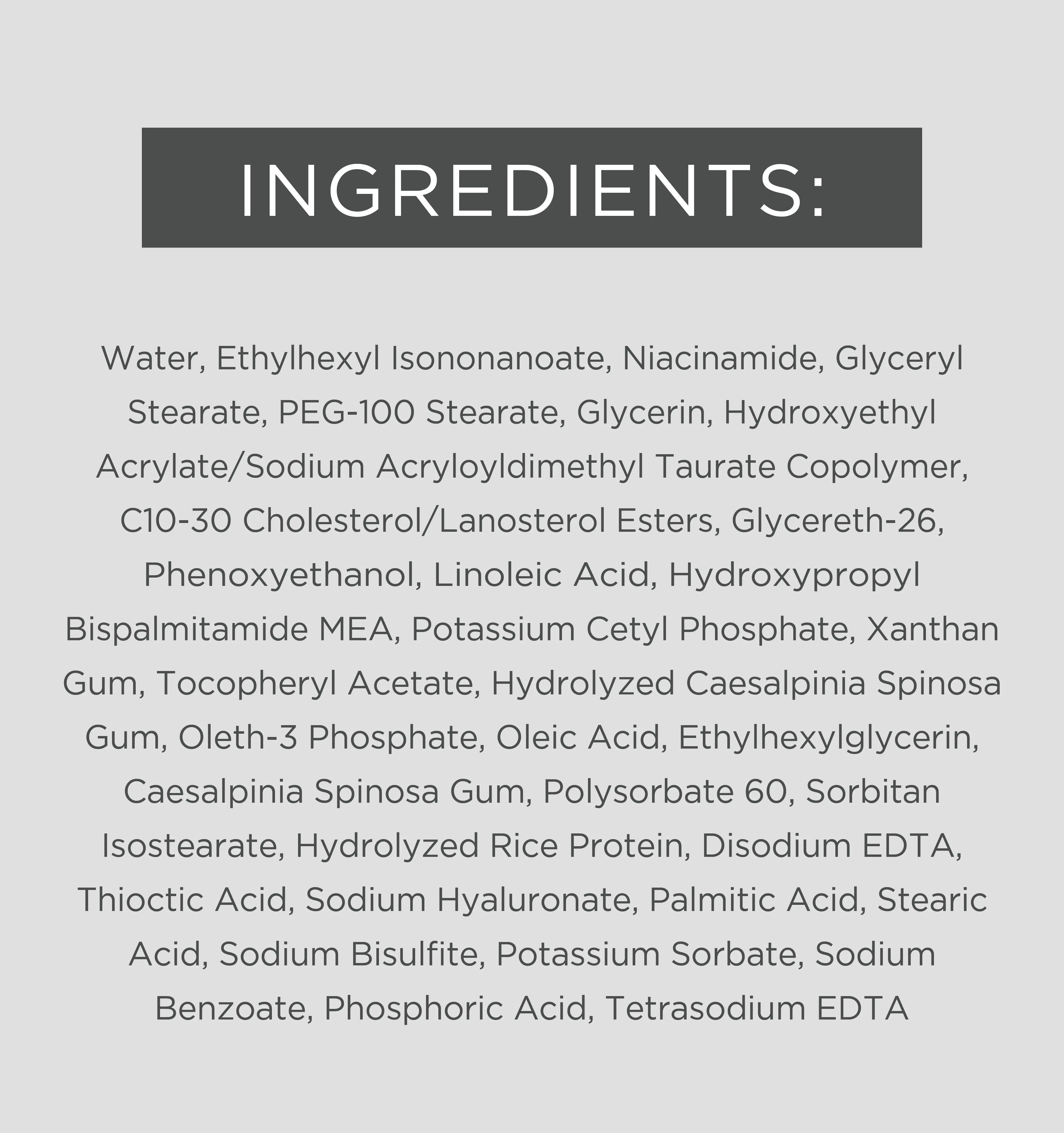Ingredients : Water, Ethylhexyl Isononanoate, Niacinamide, Glyceryl Stearate, PEG-100 Stearate, Glycerin, Hydroxyethyl Acrylate/Sodium Acryloyldimethyl Taurate Copolymer, C10-30 Cholesterol/Lanosterol Esters, Glycereth-26, Phenoxyethanol, Linoleic Acid, Hydroxypropyl Bispalmitamide MEA, Potassium Cetyl Phosphate, Xanthan Gum, Tocopheryl Acetate, Hydrolyzed Caesalpinia Spinosa Gum, Oleth-3 Phosphate, Oleic Acid, Ethylhexylglycerin, Caesalpinia Spinosa Gum, Polysorbate 60, Sorbitan Isostearate, Hydrolyzed Rice Protein, Disodium EDTA, Thioctic Acid, Sodium Hyaluronate, Palmitic Acid, Stearic Acid, Sodium Bisulfite, Potassium Sorbate, Sodium Benzoate, Phosphoric Acid, Tetrasodium EDTA.