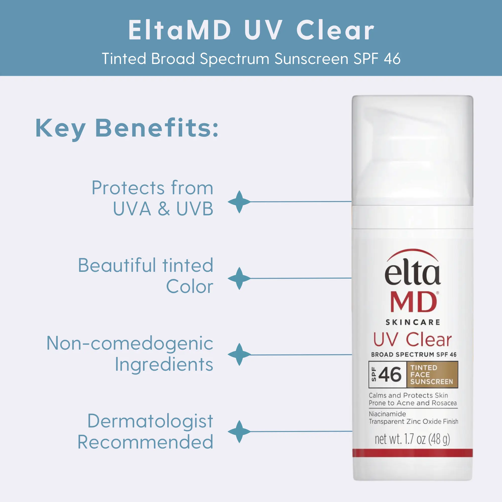 Oil-free EltaMD UV Clear helps calm and protect sensitive skin types prone to discoloration and breakouts associated to acne and rosacea. It contains niacinamide (vitamin B3), hyaluronic acid and lactic acid, ingredients that promote the appearance of healthy-looking skin. Very lightweight and silky, it may be worn with makeup or alone. Choose from tinted and untinted formulas for use every day.