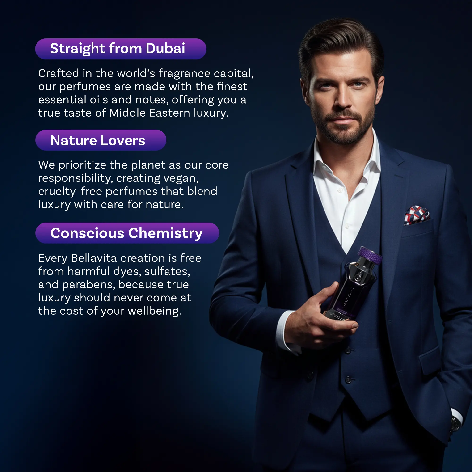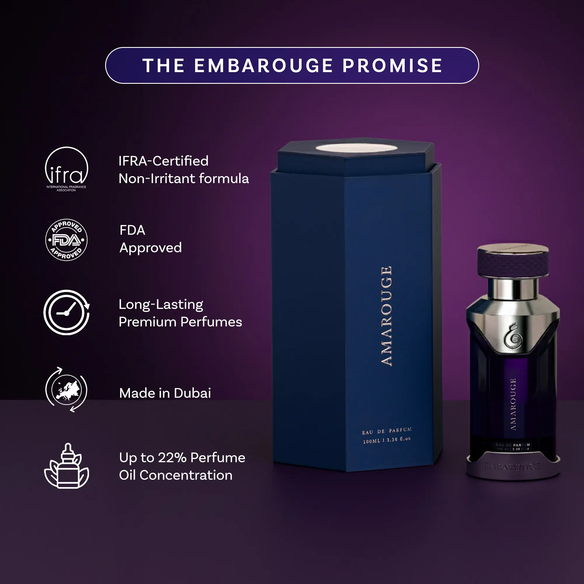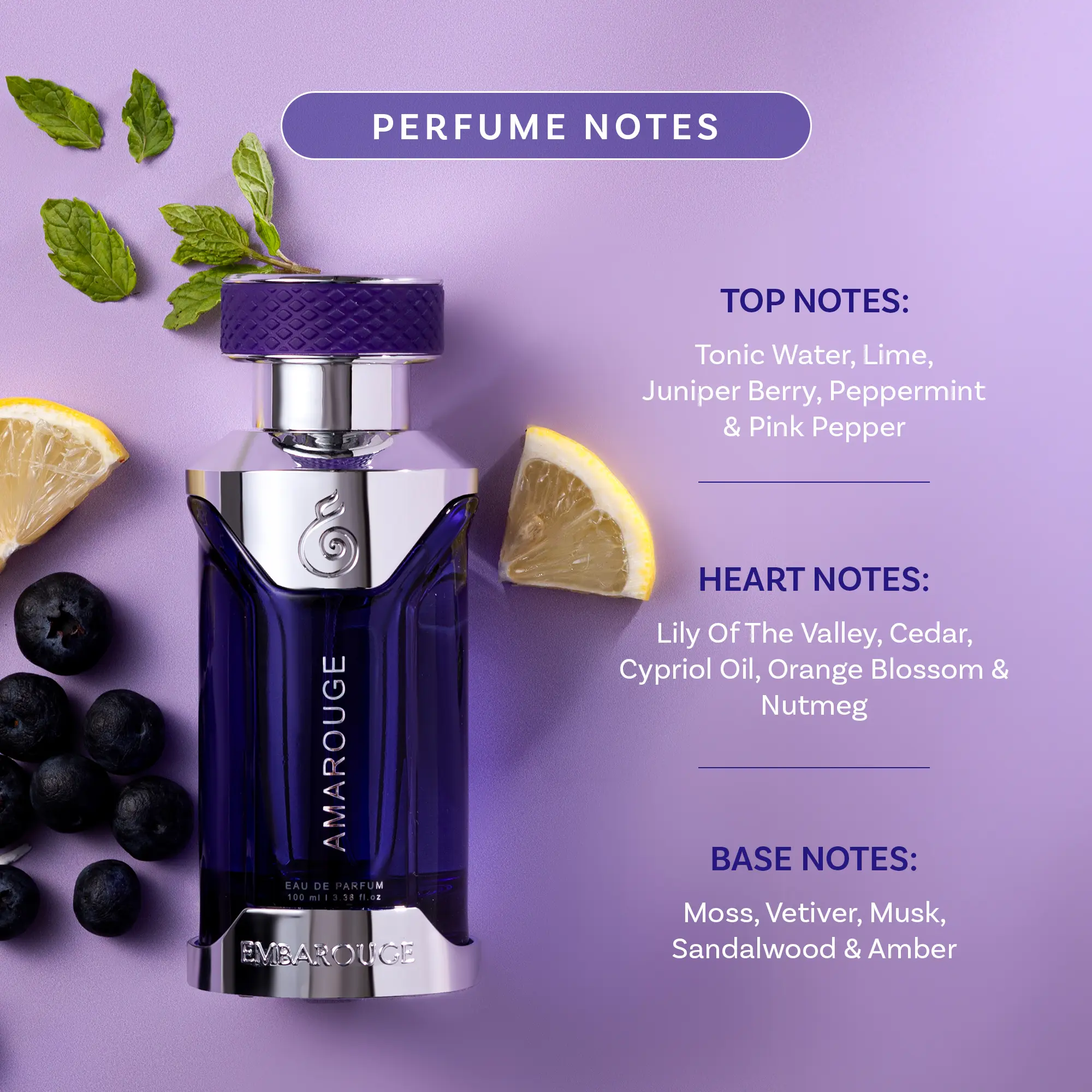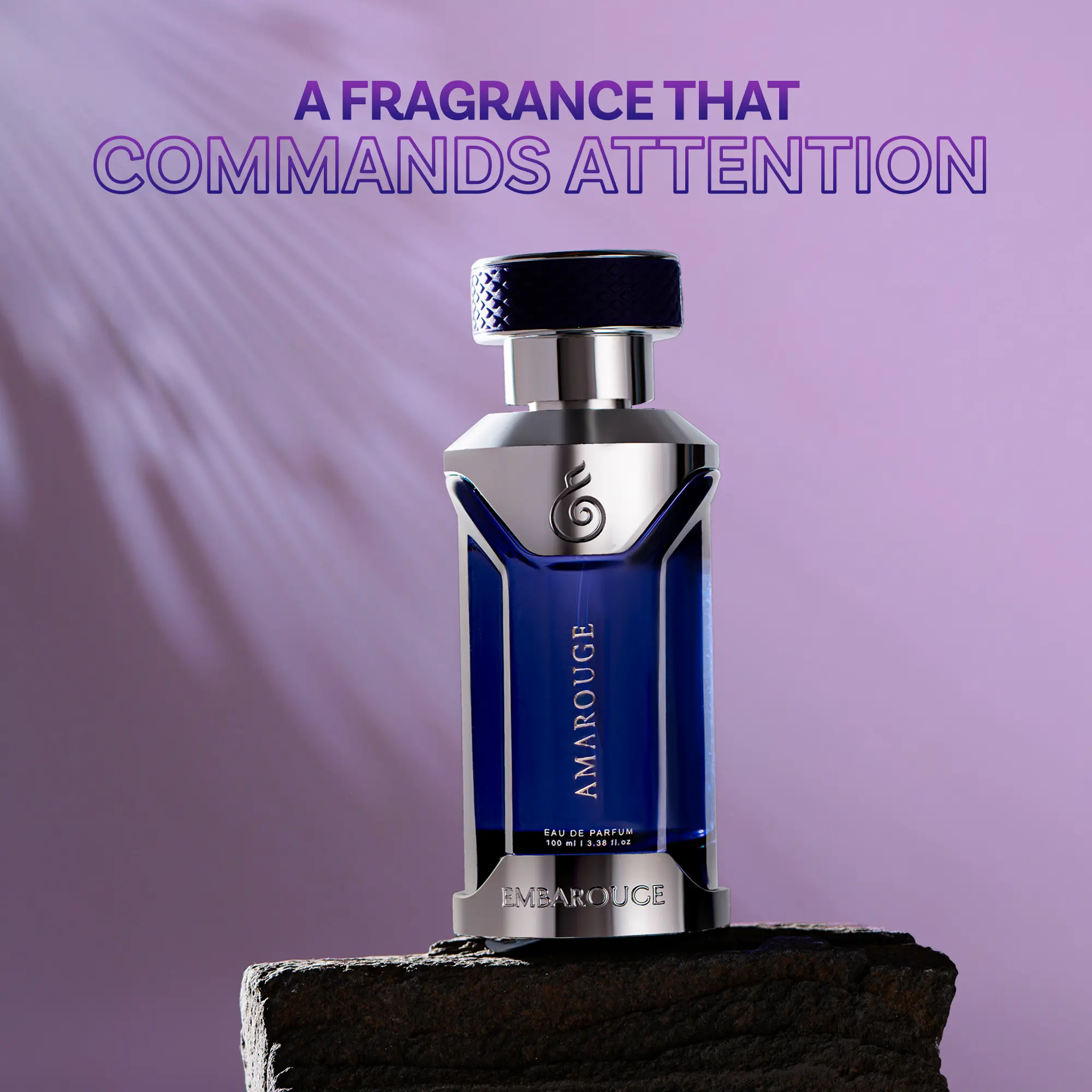 EMBAROUGE Amarouge is a bold Eau de Parfum crafted for the modern man who wants a scent that feels clean, energetic, and effortlessly sophisticated. It opens with a vibrant blend of tonic water, lime, juniper berry, peppermint, and pink pepper — instantly refreshing and dynamic. The heart unfolds into lily of the valley, cedar, cypriol oil, orange blossom, and nutmeg, adding smooth masculinity and depth. Finally, the fragrance settles into a warm, woody base of vetiver, moss, musk, sandalwood, and amber — leaving a confident, addictive trail.