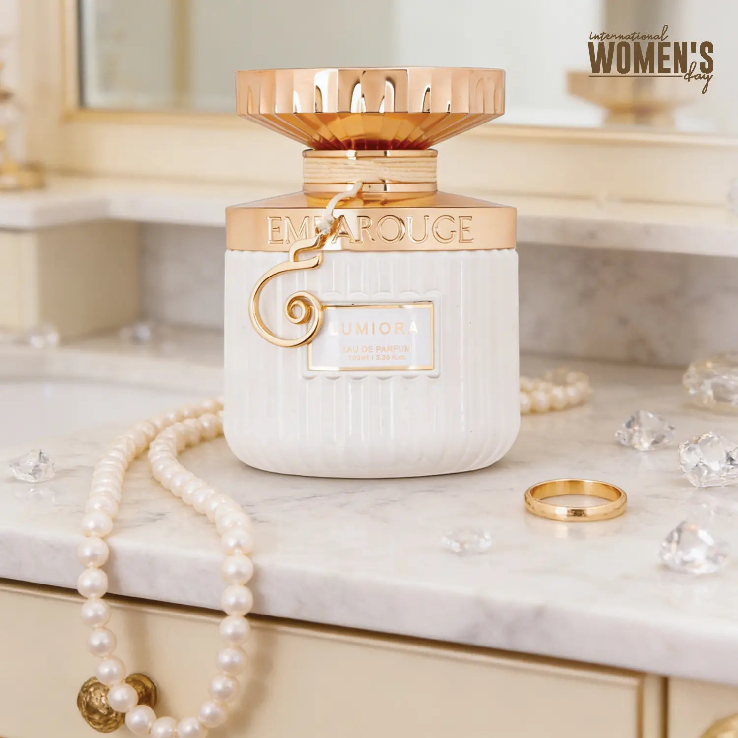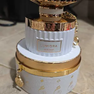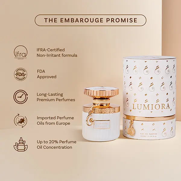 EMBAROUGE Lumiora is an opulent Eau de Parfum designed for the modern, self-assured woman. It weaves sparkling black currant and fresh aquatic notes into a heart of blooming rose, cyclamen, narcissus, and jasmine, creating a captivating, floral-oriental signature.